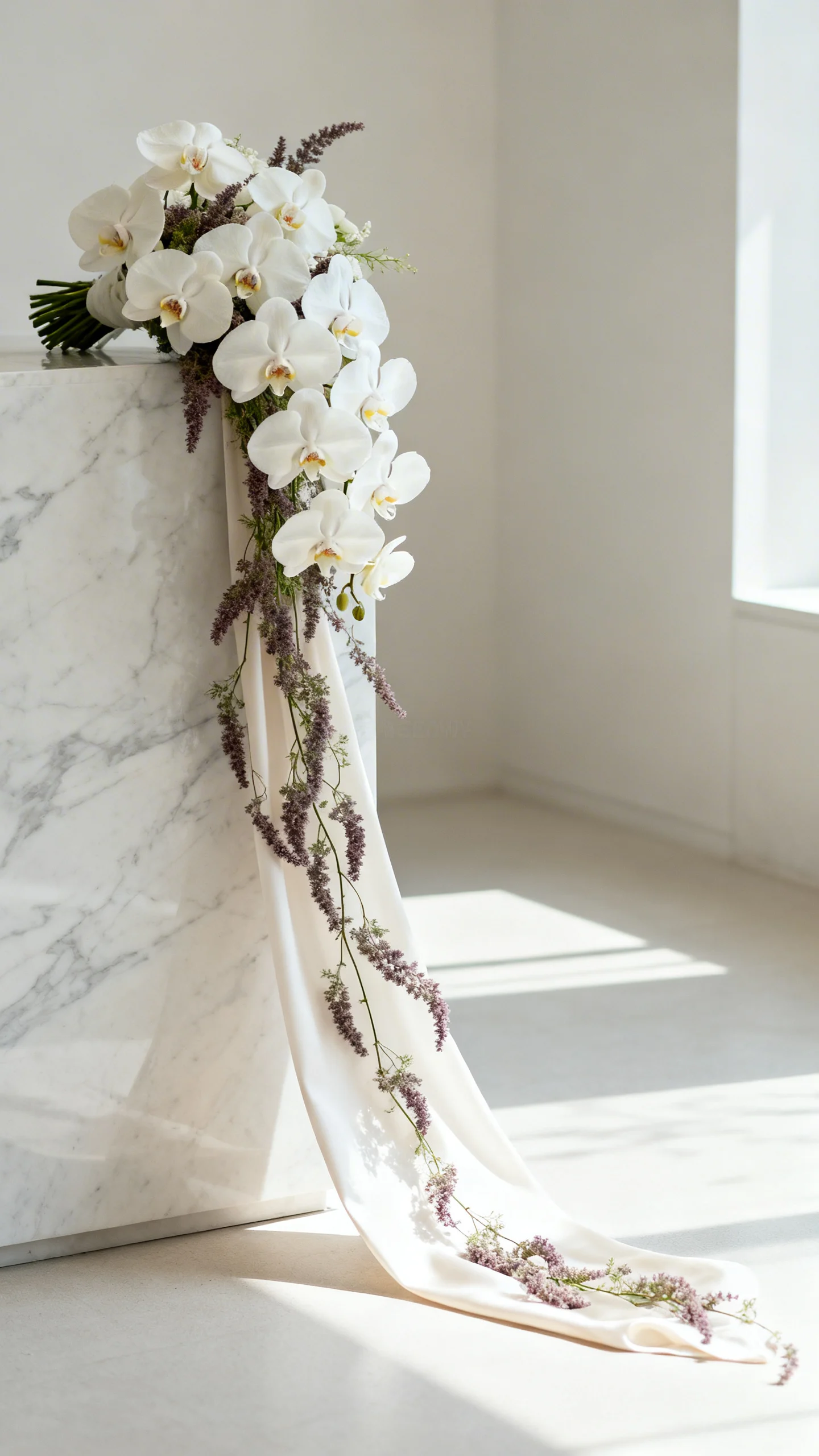 Cascades are back, but they’re slimmer, more sculptural, and less heavy than older styles. Instead of a big waterfall shape, brides are opting for a gentle drape using orchids, amaranthus, or trailing greenery. The key is balance: the bouquet should elongate the look without overwhelming the dress. Ask for a “soft cascade” that looks intentional from every angle.
