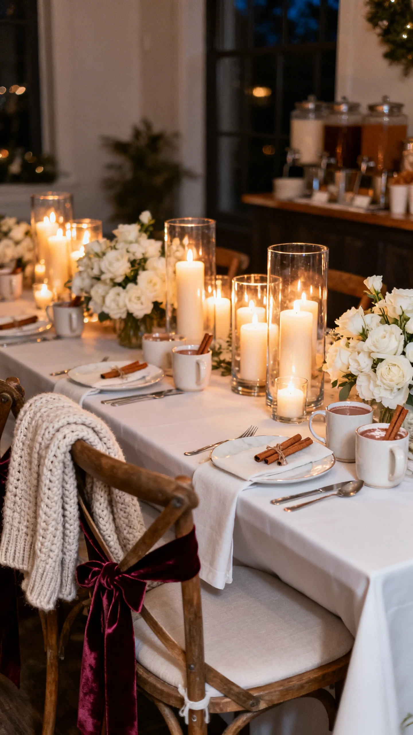 For a cooler-season shower, go cozy and glowing with layered whites, warm neutrals, and lots of candles. Use textures like velvet ribbon, knit throws on chairs, and creamy florals for softness. A hot cocoa or chai bar makes the menu feel thoughtful and guest-friendly. It’s intimate, elegant, and perfect for an evening shower.