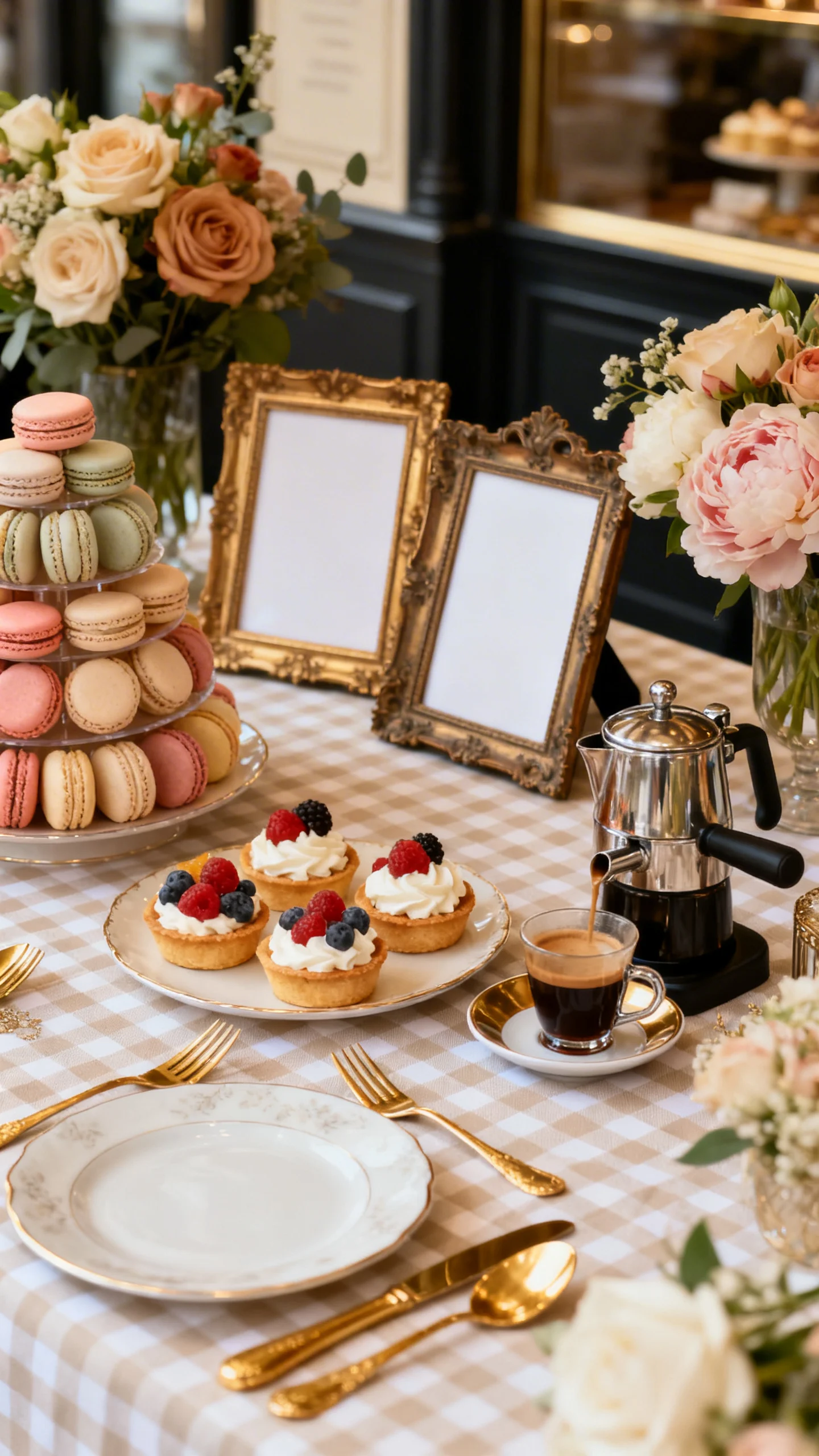 Bring in French café vibes with gingham, gold accents, and a pastry-forward menu. A macaron tower, mini tarts, and espresso bar instantly set the mood. Use romantic florals and a few vintage-style frames for signage. Keep music light and jazzy to round out the ambiance.