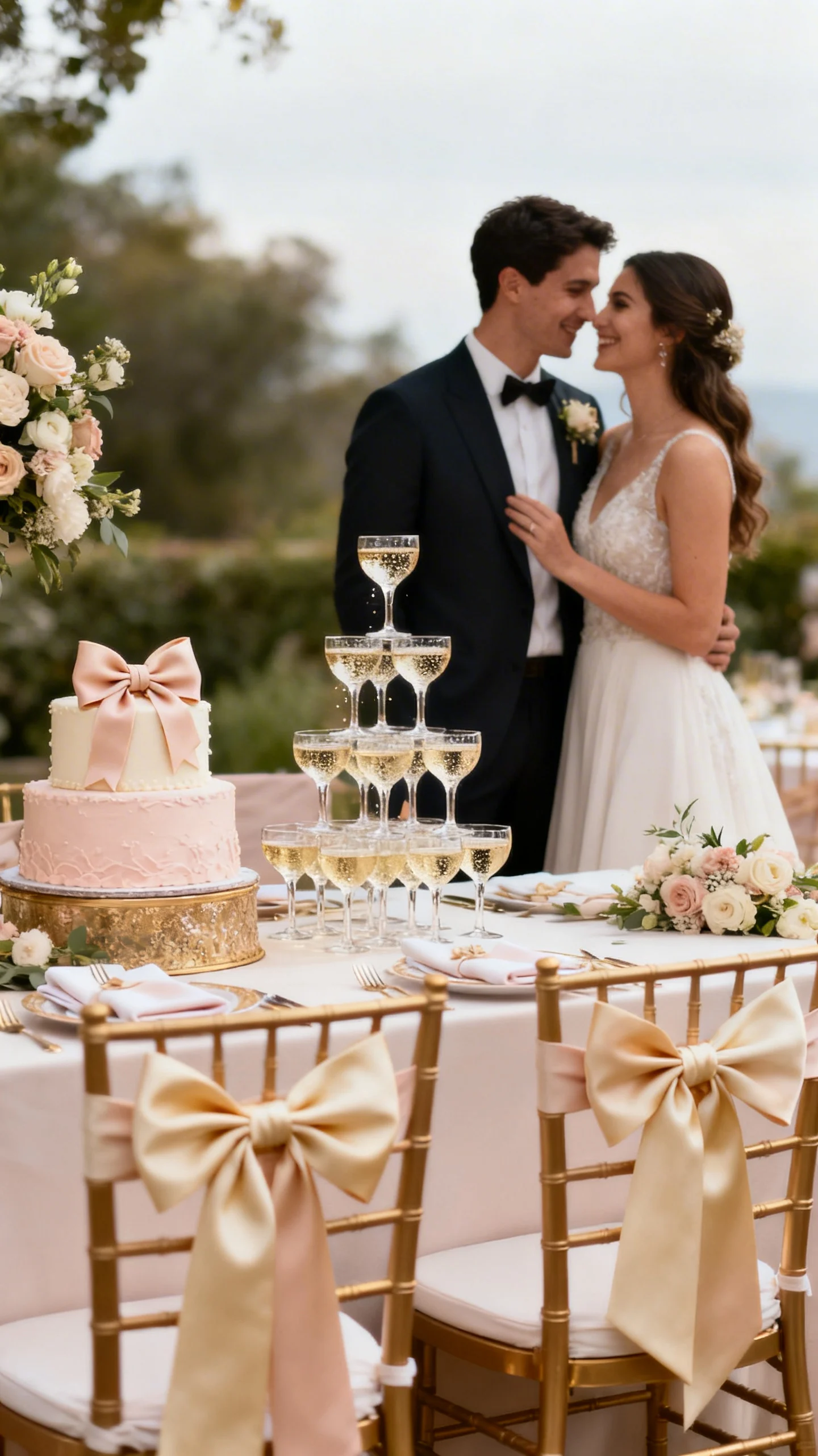 This theme feels celebratory and sweet, with bow details on napkins, chair backs, cake decor, and gift tags. Add a champagne tower moment (or sparkling cider) as the main photo-op. Keep the palette soft—blush, ivory, and gold work beautifully. It’s a fun way to tie into wedding fashion trends without going overboard.