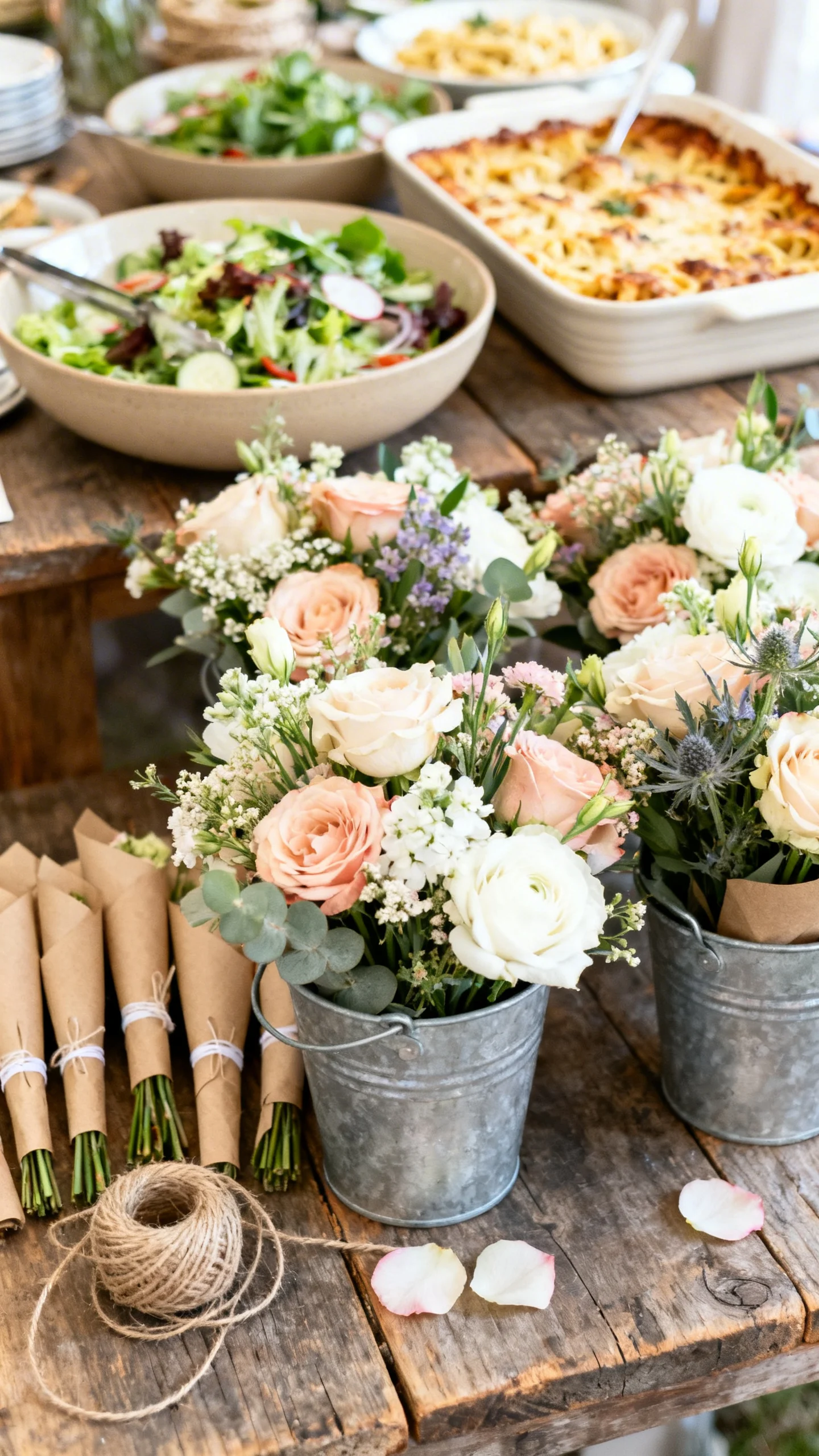 Set up a “flower market” station where guests can build mini bouquets to take home. Use kraft paper wraps, twine, and handwritten tags for a cozy, elevated look. Pair it with a simple buffet—salads, baked pastas, and a dessert table with rustic textures. This theme doubles as both activity and favor, making it super practical.