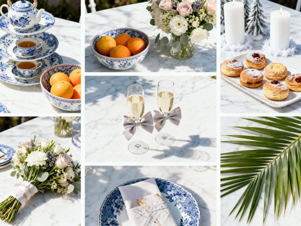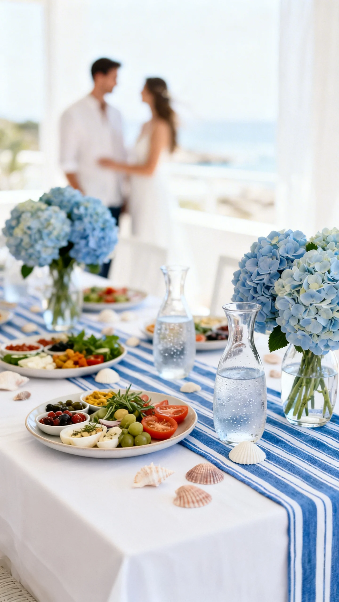 Lean into crisp whites and layered blues for a fresh, wedding-adjacent look. Think striped linens, hydrangeas, shells used sparingly, and a seafood-friendly menu or Mediterranean mezze. Use blue stationery and a “something blue” dress code for photos that feel coordinated. This works indoors or outdoors and feels chic without being themed too literally.