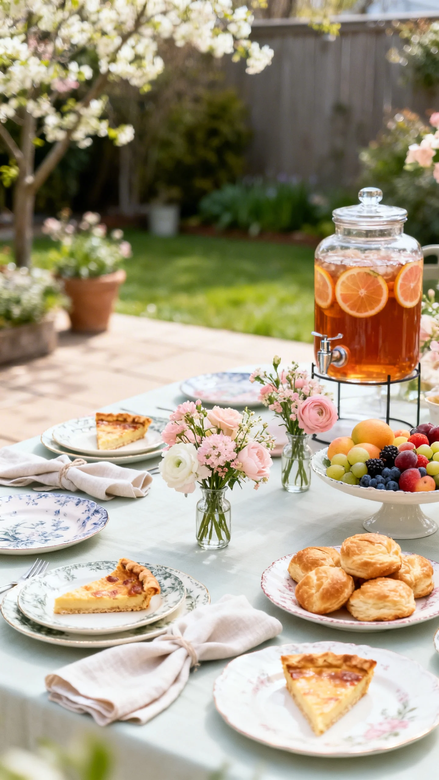 Go airy and romantic with soft florals, mismatched china, and a backyard or patio setup. Keep the menu light with quiche, fruit, pastries, and a signature iced tea or bubbly bar. Add simple place cards and floral bud vases to make it feel elevated without a big spend. It’s especially pretty in spring and early summer.