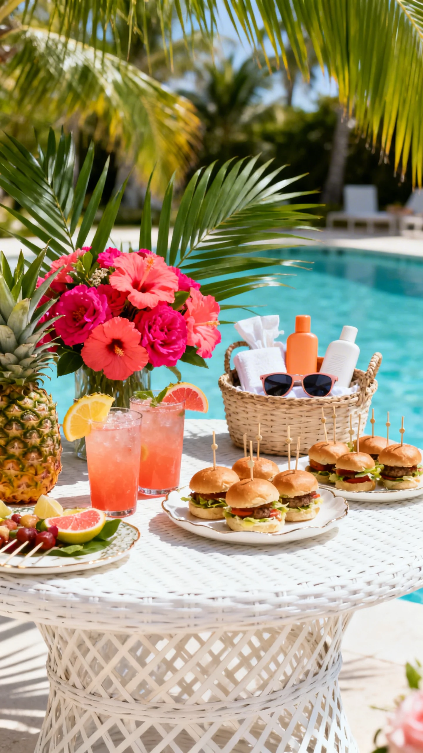 Even without a pool, you can create a resort feel with palm leaves, bright blooms, and fruity drinks. Choose a bold color palette like coral, fuchsia, and emerald, then balance it with plenty of white. Serve sliders, skewers, and chilled bites that are easy to mingle with. Add a sunglasses-and-sunscreen “amenities” basket as a playful, useful touch.