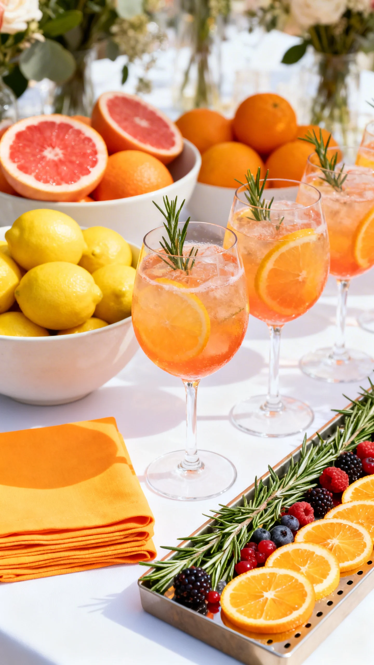 Bright citrus colors photograph like a dream and make even a simple room feel sunny. Decorate with lemons, oranges, and grapefruit accents—real fruit in bowls doubles as decor and snack. Serve spritz-style mocktails and cocktails with a build-your-own garnish bar. Finish with citrus-scented candles or mini marmalade jars as favors.