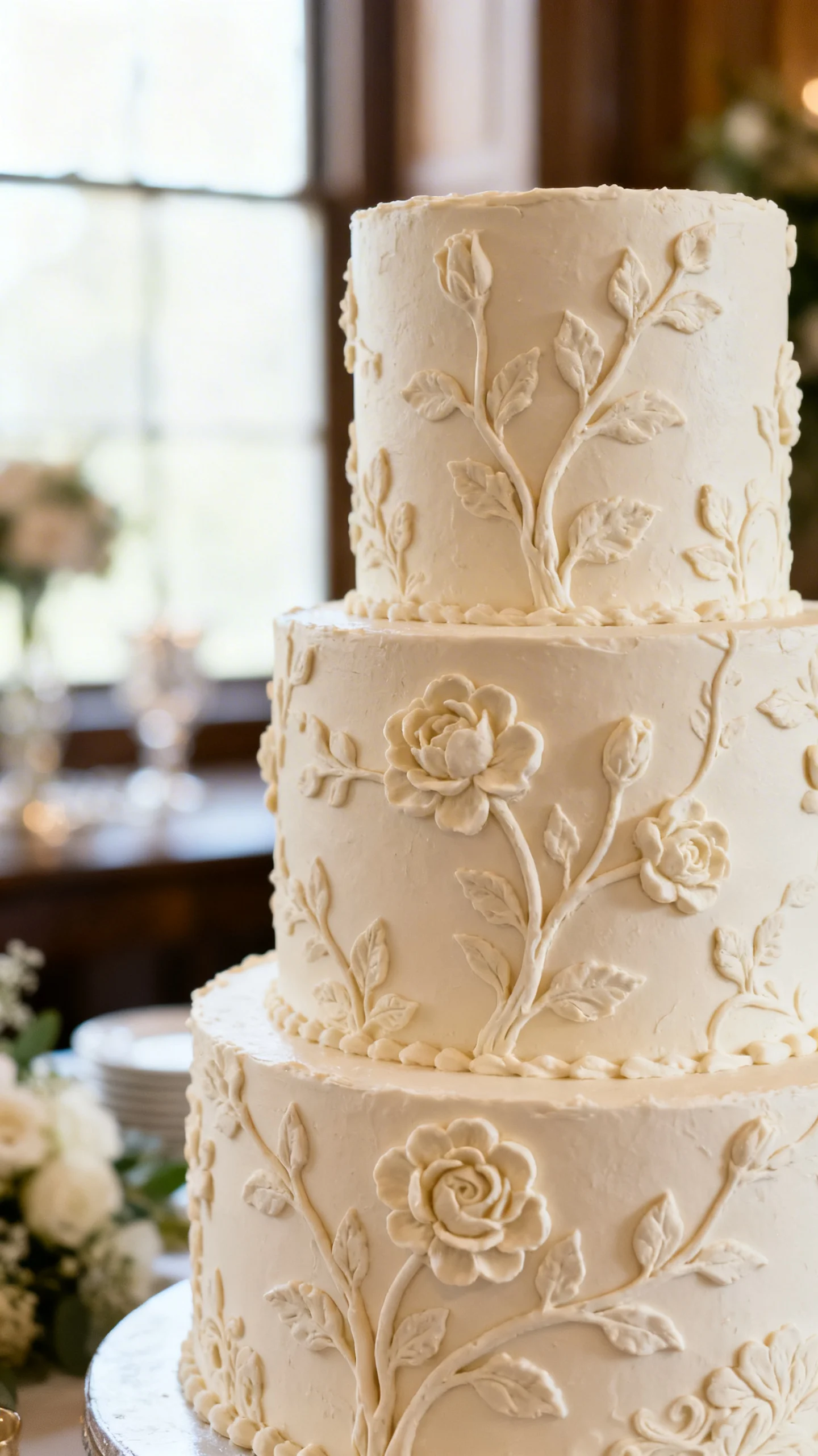 Bas-relief piping creates raised floral or vine patterns that look like carved plasterwork. Keeping the design tone-on-tone makes it feel classic rather than fussy. This is a great choice if you love florals but want something more refined than bright sugar blooms. It pairs well with traditional ceremonies and romantic venues.