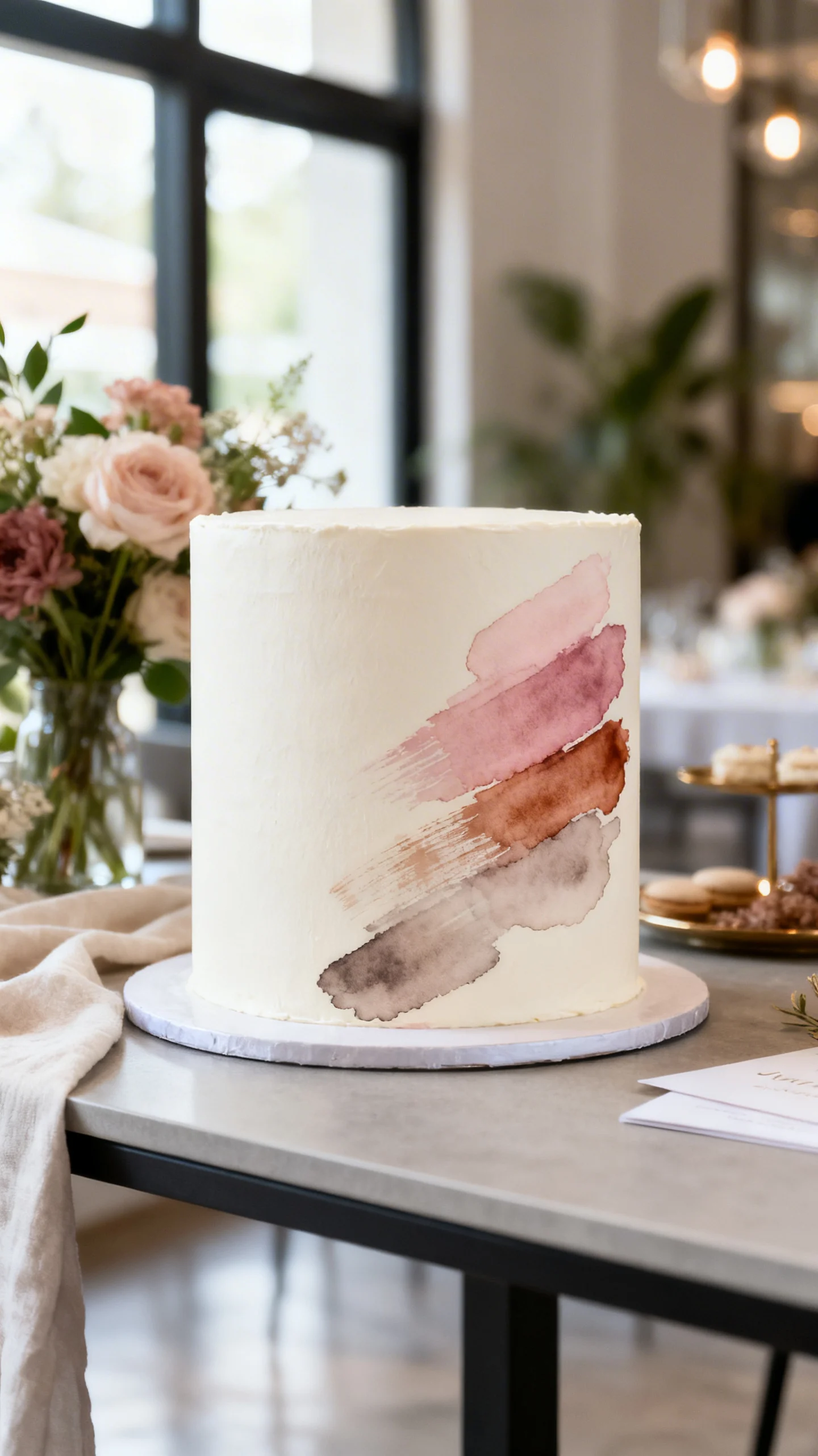 Watercolor-style brushstrokes can look like a contemporary canvas when done with a restrained palette. Choose two to three hues that match your wedding flowers or stationery, then keep the placement intentional—one side, a corner, or a single tier. This feels custom and artistic without turning the cake into a theme piece. It’s especially stunning on smooth fondant or ultra-sleek buttercream.