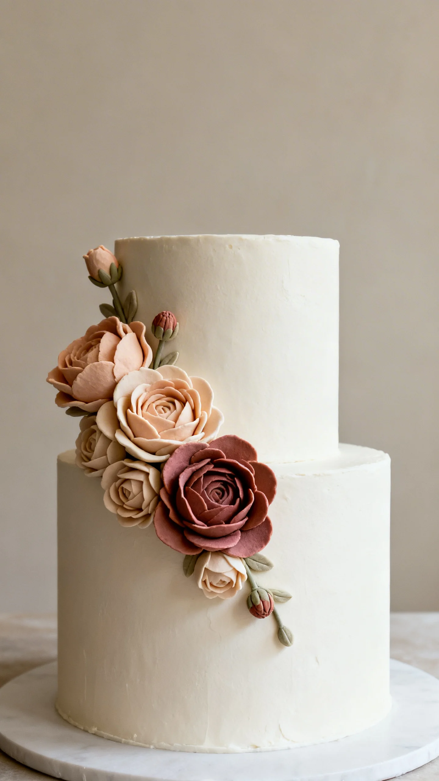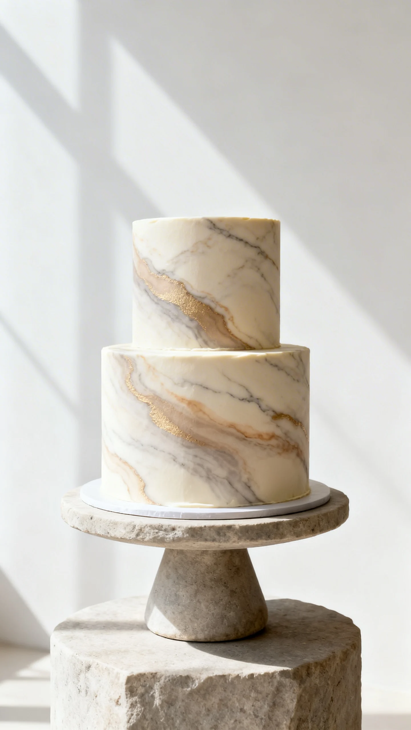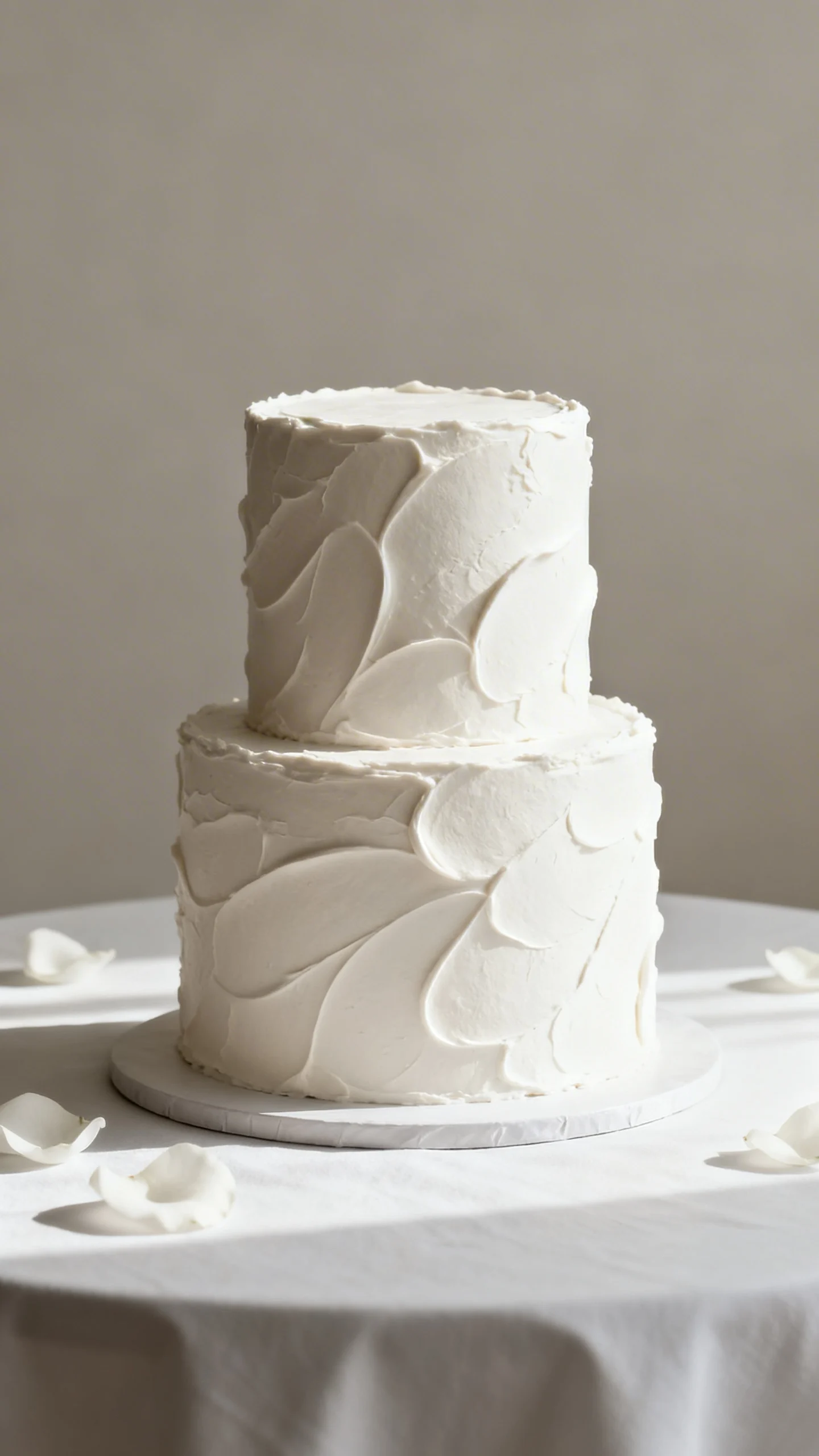 Choose one color—ivory, soft blush, warm white, or dove gray—and let texture do the talking. Ask for subtle palette-knife strokes, vertical ribbing, or a smooth finish with intentional curves. This keeps the cake “quiet-luxury” and avoids anything that feels overly themed. Pair it with minimal décor so the surface work reads like art.