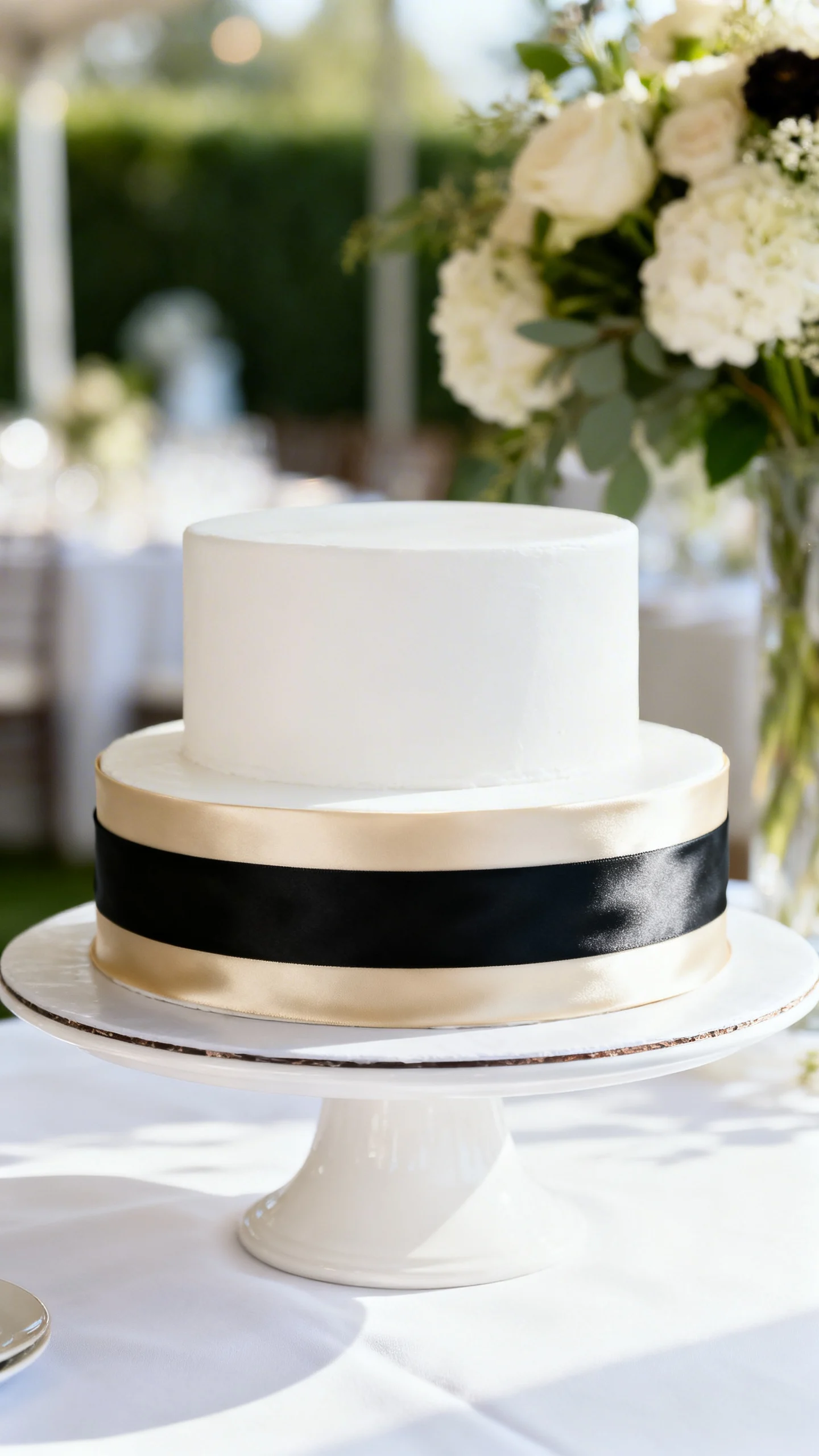 A smooth white cake becomes instantly “designed” with a wide silk or satin ribbon wrapped neatly around one or two tiers. Choose a ribbon color pulled from your palette—champagne, black, dusty blue, or soft sage all photograph beautifully. This reads like fashion: simple, tailored, and intentional. Make sure the ribbon is food-safe and removable before cutting.