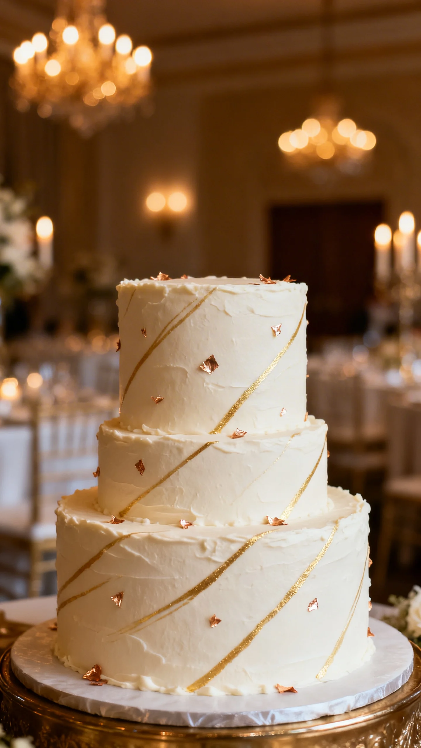 Instead of full gold drip, request thin hand-painted lines or tiny flecks of edible metallic leaf placed with restraint. The effect is like jewelry: delicate, intentional, and high-end. This style shines in candlelight and photographs beautifully without stealing the spotlight. Keep metals consistent with your flatware or invitations for a cohesive look.