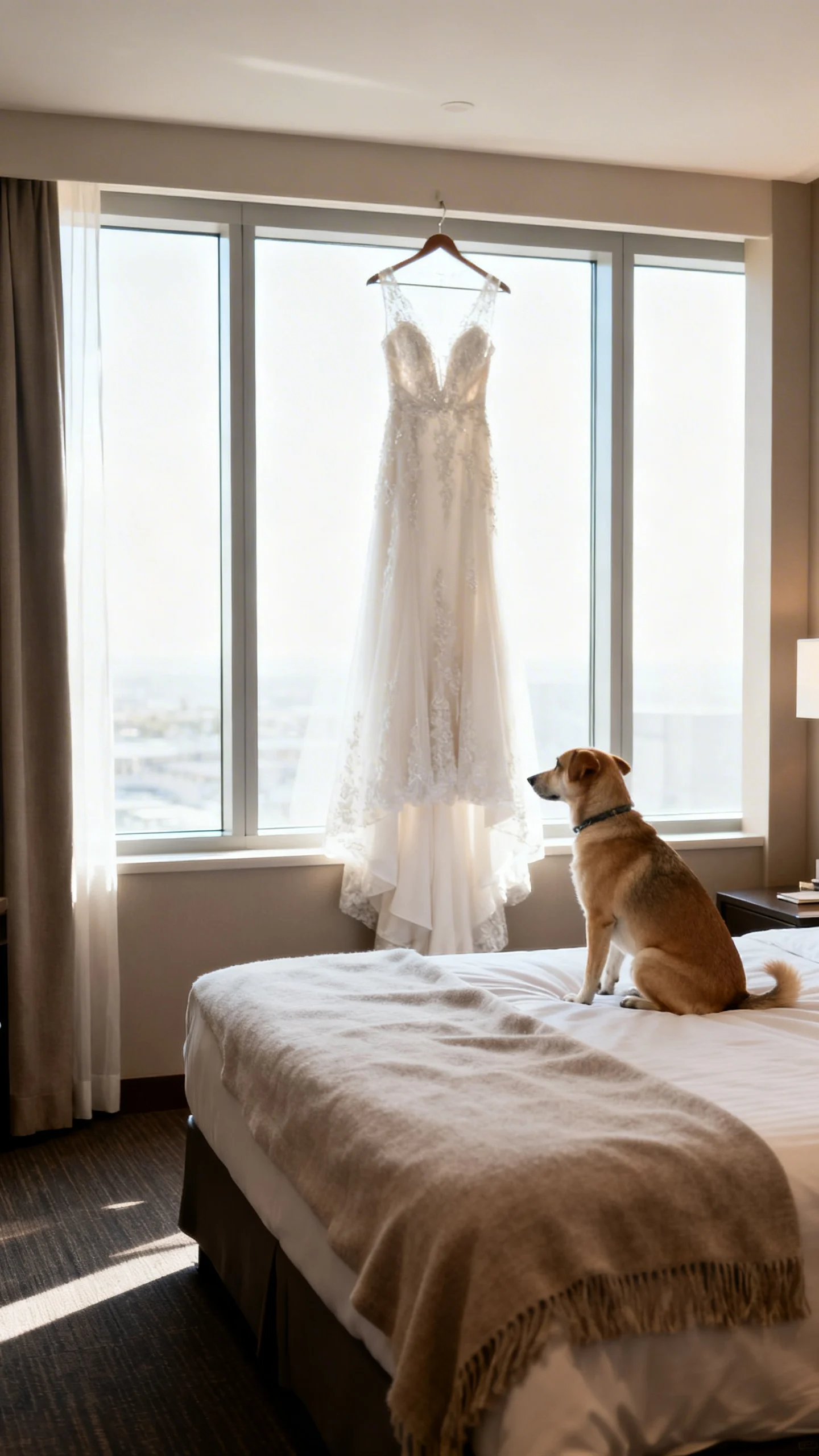 Invite your pet to join you for a few calm photos while you’re getting ready—think on the bed, by a window, or next to your dress hanging up. This keeps the moment relaxed and avoids overstimulating them later during cocktail hour. Ask your photographer for a short, dedicated block so you’re not chasing spontaneous shots. A lint roller and a neutral throw blanket go a long way for clean, editorial-looking images.