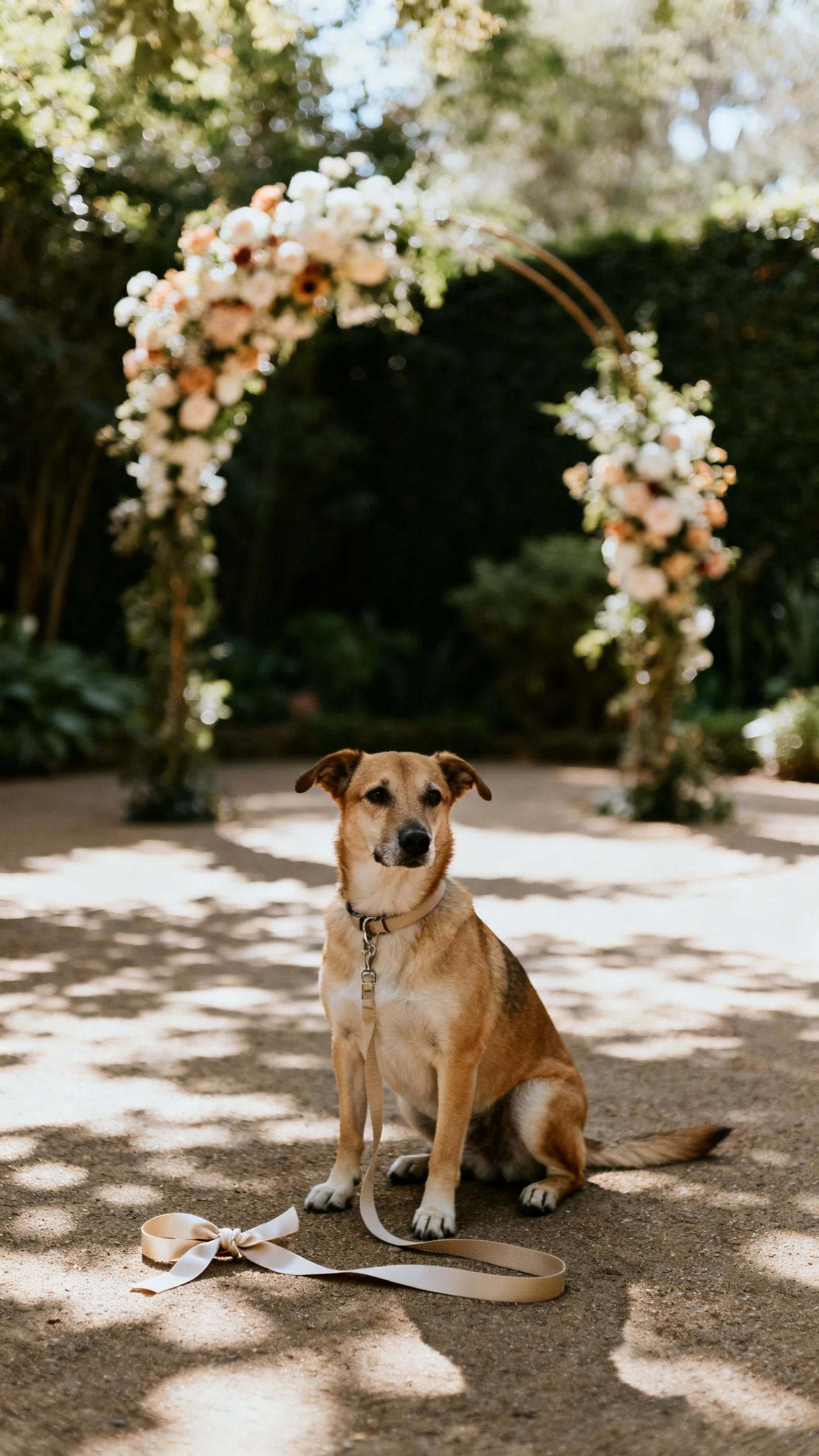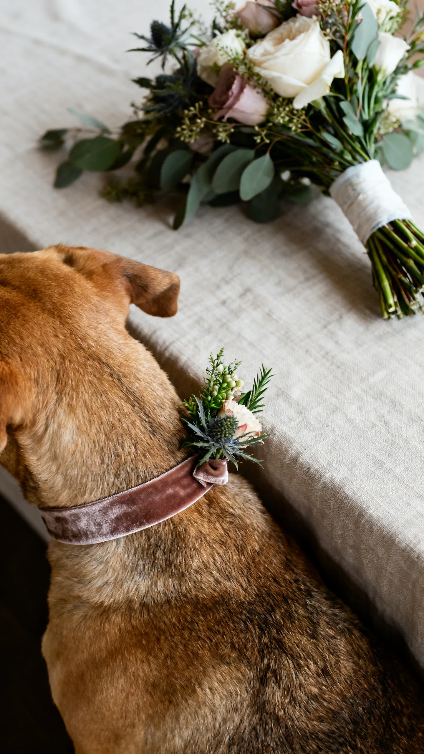 A floral collar, velvet ribbon, or custom bandana can tie your pet into the overall aesthetic without feeling costume-y. Stick to soft, lightweight materials and skip anything that dangles or could snag. Coordinate with your florist for a mini arrangement using hardy blooms (and confirm they’re pet-safe). The goal is “effortless chic,” not “uncomfortable prop.”