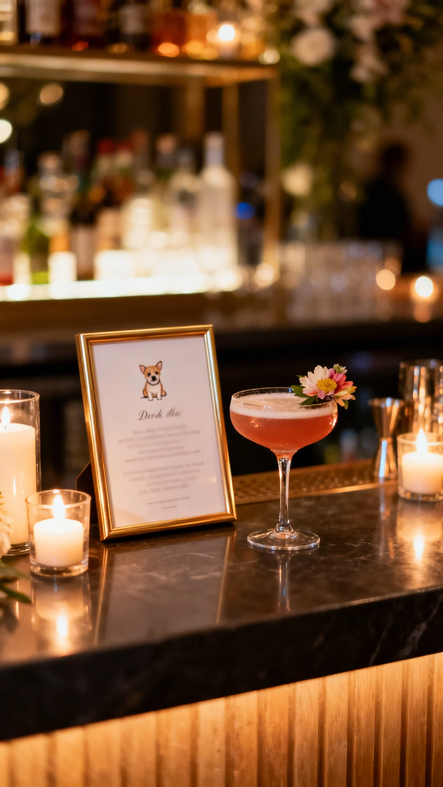 Work your pet into your seating chart, table numbers, or signature cocktail names for a playful, modern touch. For example, name a drink after your pet and add a tiny illustration on the bar sign. These details delight guests without requiring your pet to navigate loud music and a packed dance floor. It’s also a great way to keep the design cohesive from ceremony to reception.