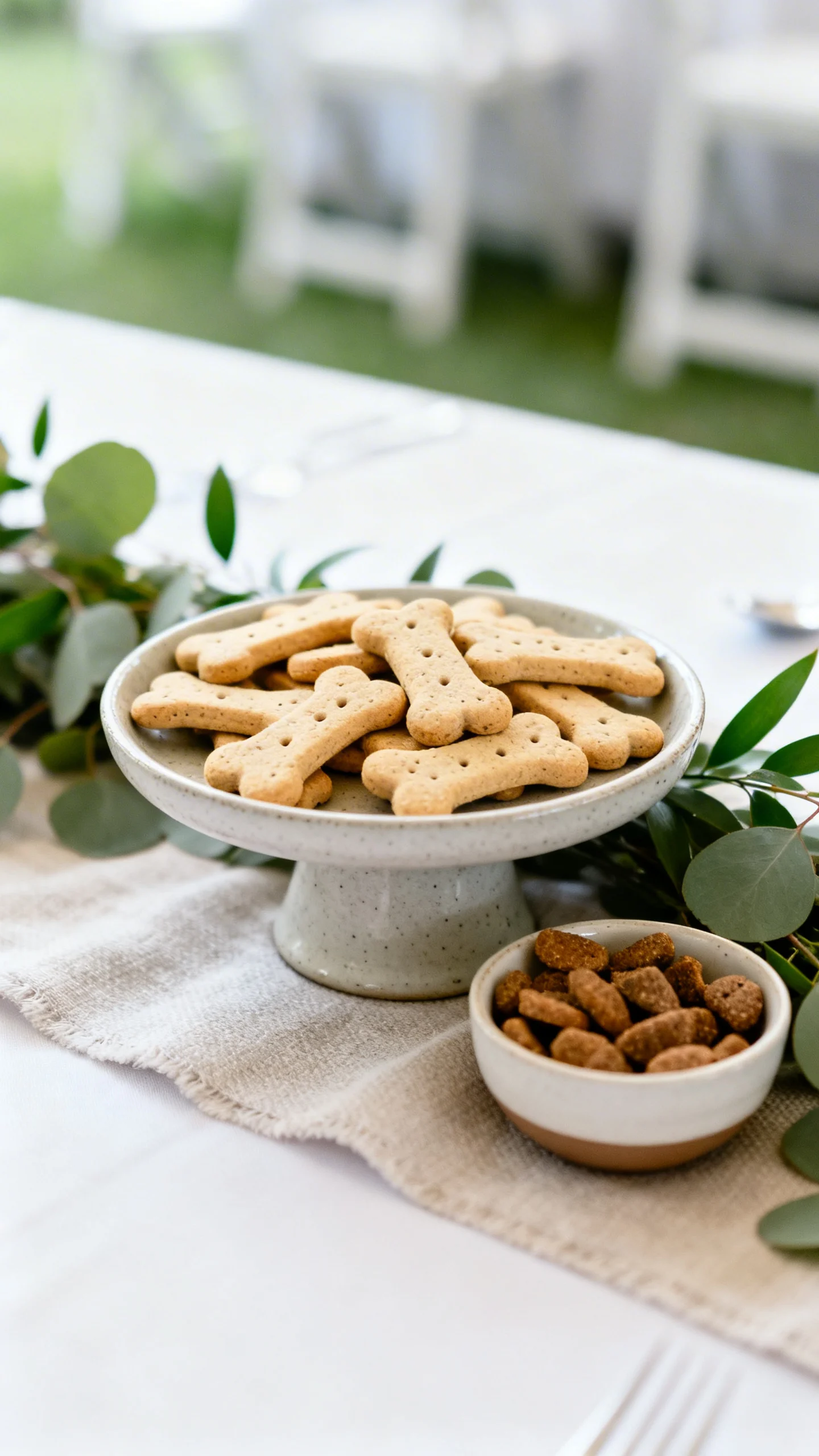 Create a small treat station with dog biscuits to-go or donate the cost of favors to a local rescue in your pet’s honor. If your pet is attending, ask your venue where treats can be offered and keep portions small to avoid tummy trouble. Tie the look into your dessert styling with coordinated labels and a clean display. It’s a fun detail that still feels wedding-appropriate and curated.