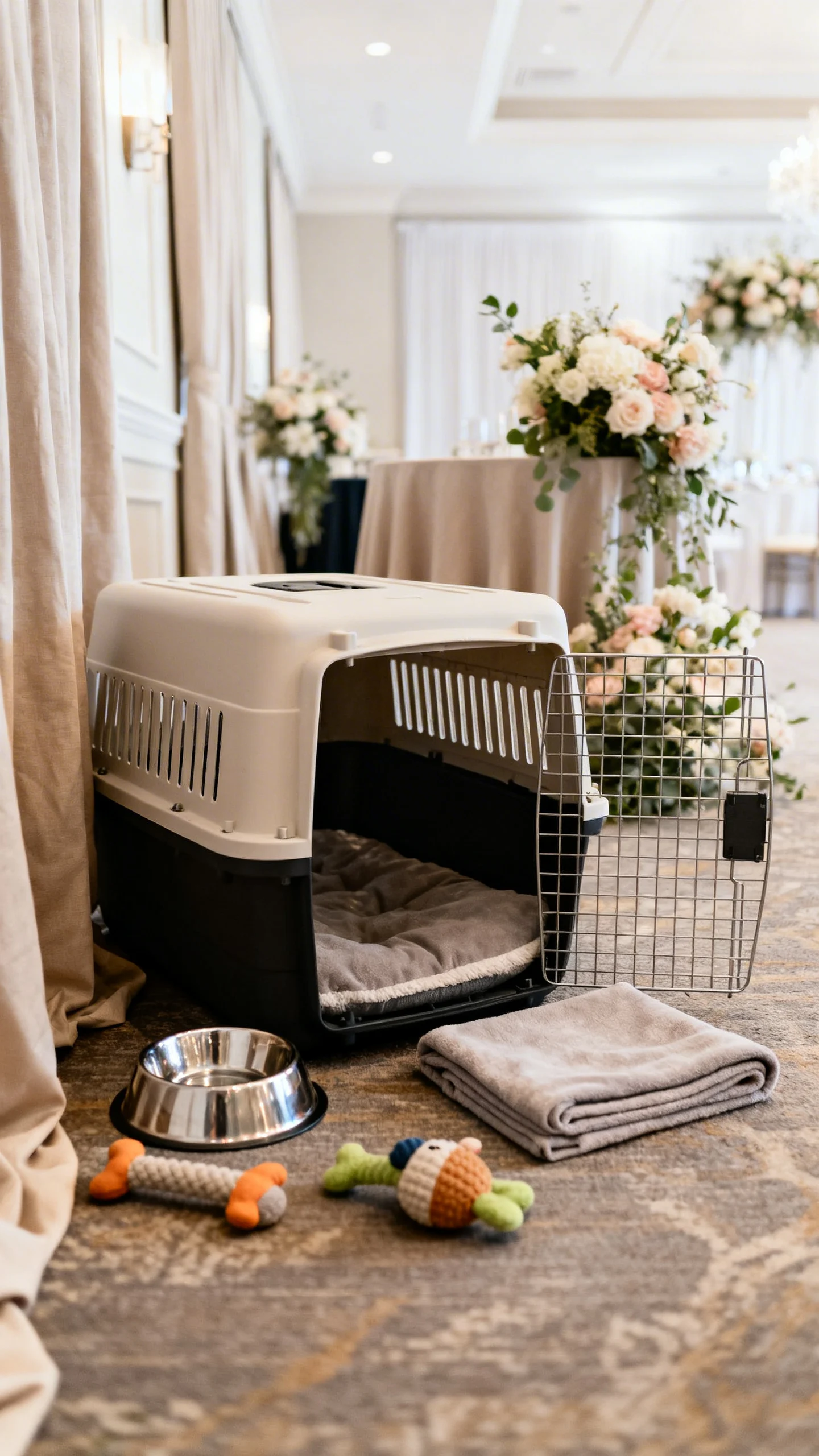 If your pet will be on-site for more than a quick appearance, create a quiet lounge area away from speakers and crowds. Think a comfortable crate or bed, water, a few familiar toys, and a sign asking guests not to overwhelm them. Hire a pet attendant (or assign a responsible friend who isn’t in the wedding party) to handle breaks and check-ins. This is the easiest way to keep things safe while still including them in the day.