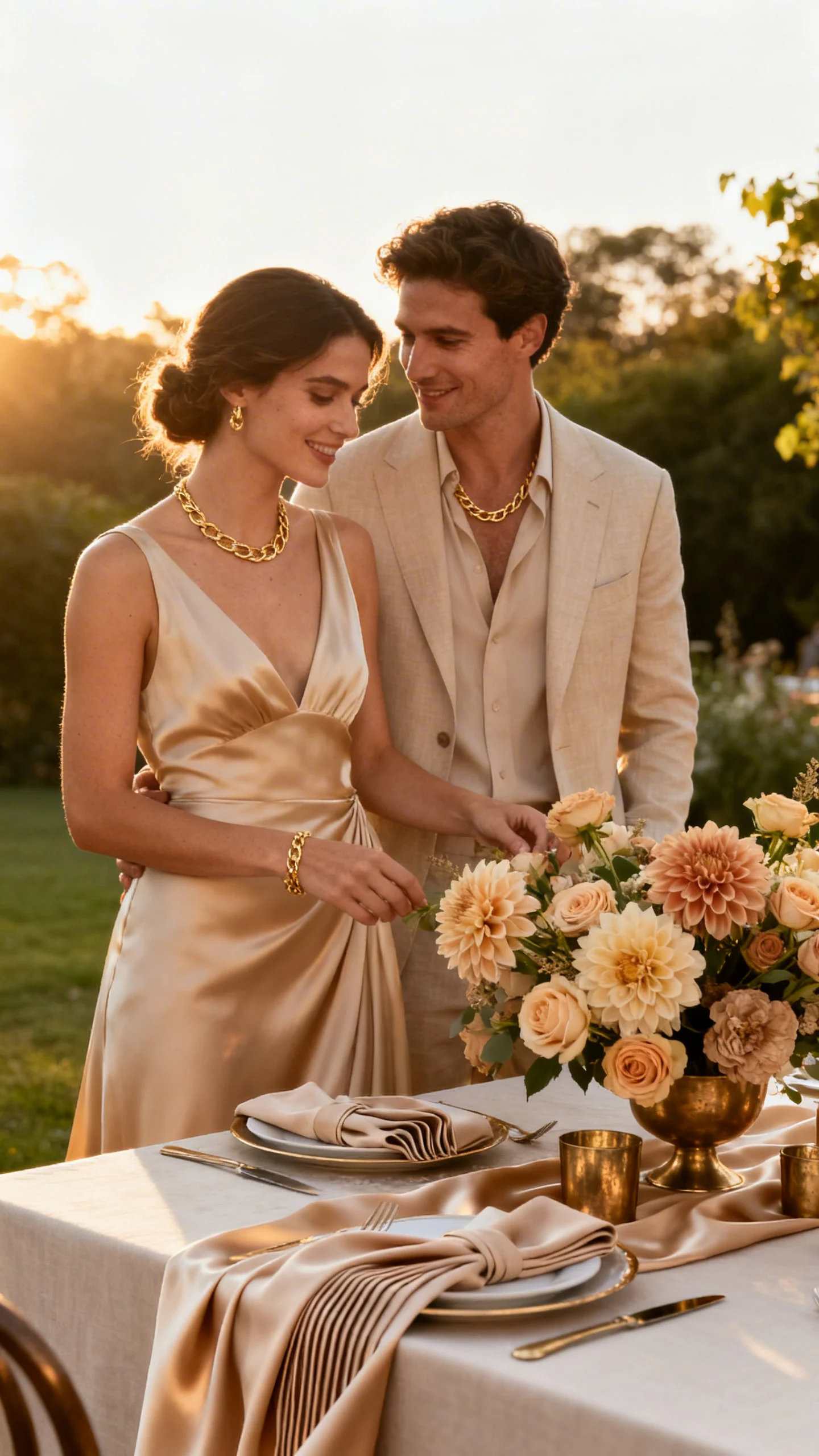 Soft luxury loves texture, so build a neutral palette around champagne, ecru, and warm beige. Add silk table runners, pleated linen napkins, and tonal floral varieties like dahlias and roses. Choose warm metallics—brushed brass or soft gold—over high-shine chrome for a gentler glow. This theme is especially flattering in golden-hour summer light.