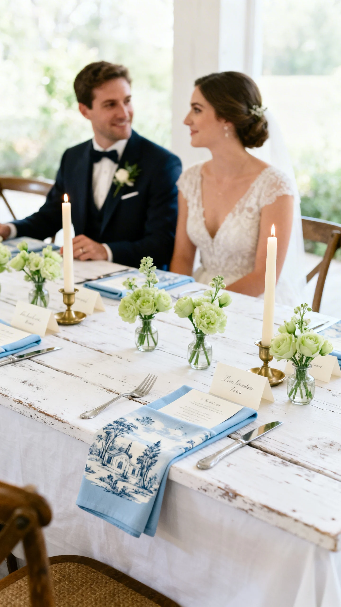 Bring in toile or delicate prints through napkins, invitation liners, or a statement escort display, then keep the rest clean and tailored. Pair with soft blues, antique white, and pale green for a fresh daytime reception. Choose tapered candles, petite bud vases, and elegant place cards to elevate the pattern. A long farmhouse table layout makes everything feel intimate and effortlessly chic.