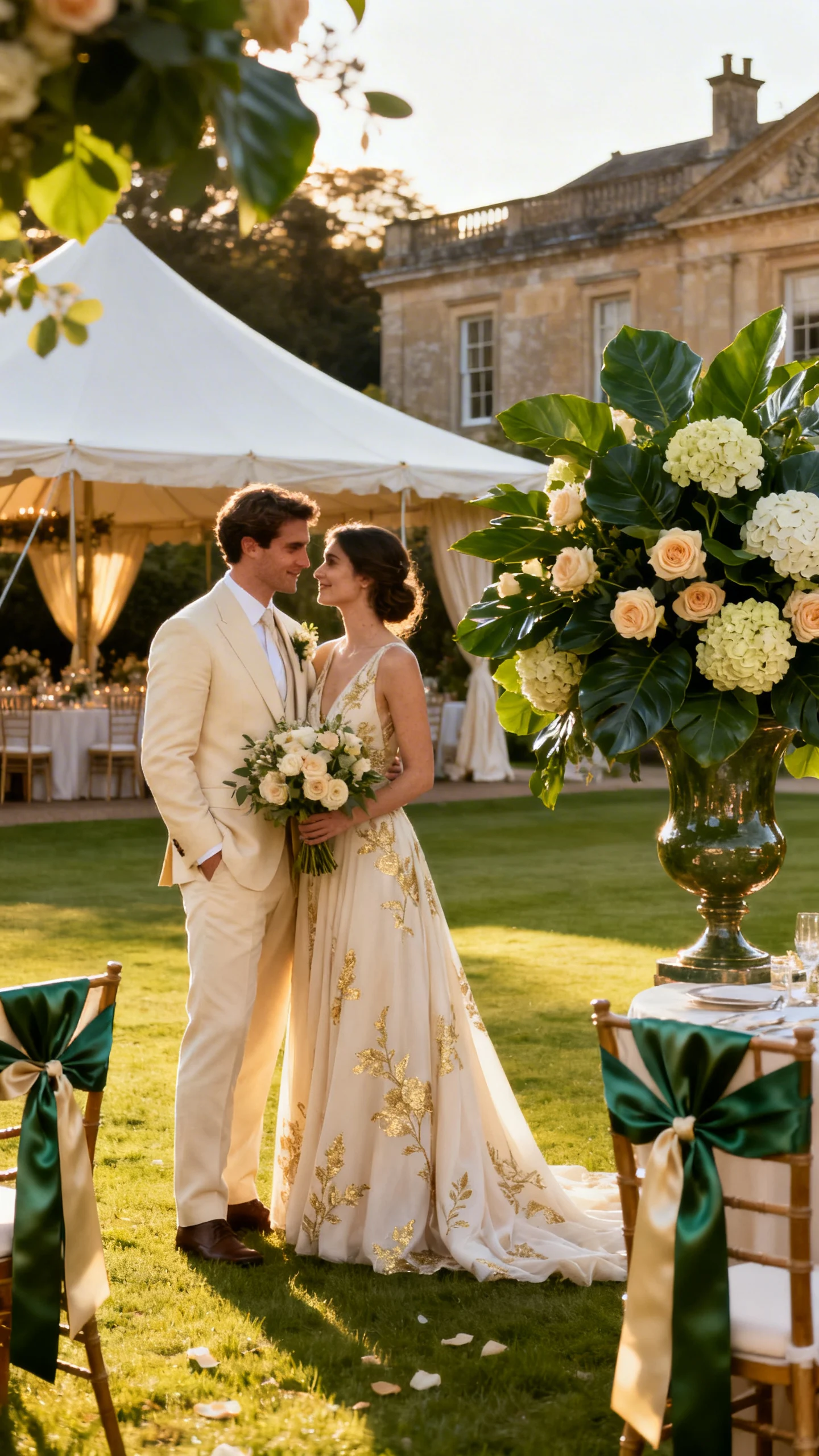 Channel estate elegance with deep leafy greens, cream, and subtle gold accents—classic, confident, and timeless. Use compote arrangements with garden roses and hydrangea for a lush look that still feels polished. Add ribbon details in satin or silk for that “finished” effect on bouquets and chairs. This theme pairs beautifully with classic venues, manicured lawns, and tented receptions.