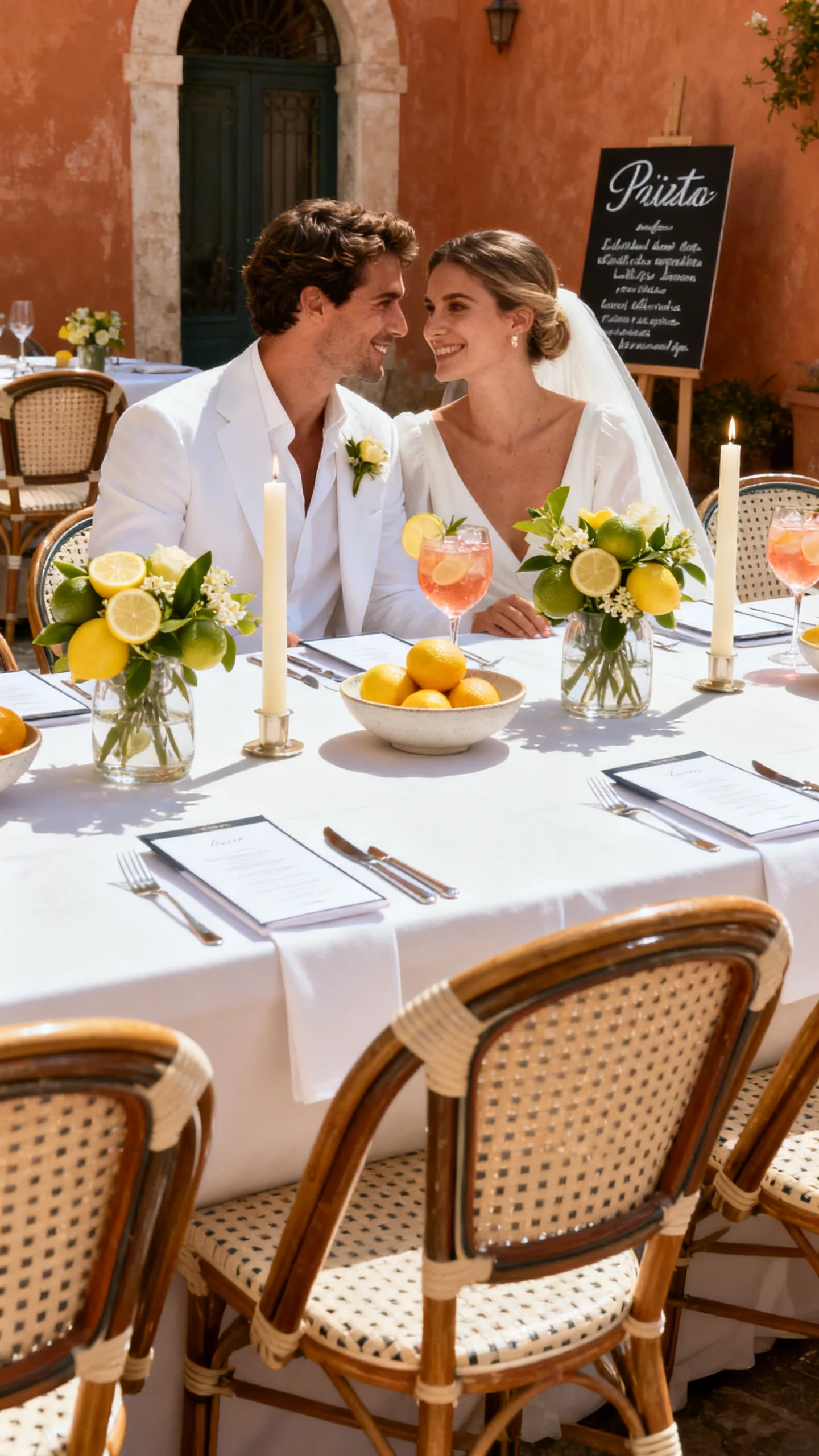Pair crisp white with lemon, bergamot, and a hint of warm terracotta for a sun-kissed, refined mood. Use citrus as a styling detail—tucked into centerpieces or displayed in shallow bowls—rather than a cartoon theme. Opt for tapered candles, slim menus, and classic bistro chairs for effortless sophistication. A spritz-inspired signature drink sign keeps it playful, not loud.