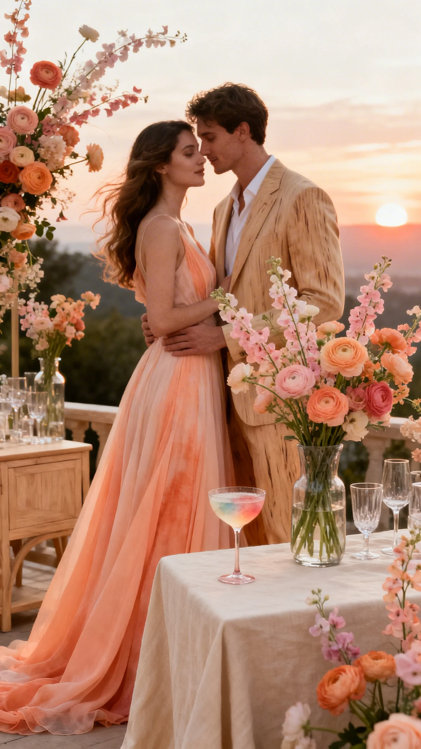 For brides who love color but still want elegance, go sorbet: peach, apricot, and pale coral with a touch of blush. Keep saturation low and lean on florals with airy movement, like ranunculus and sweet peas. Use clear glass, light wood, and creamy linens so the palette stays sophisticated. A watercolor cocktail moment can tie the hues together without feeling themed.