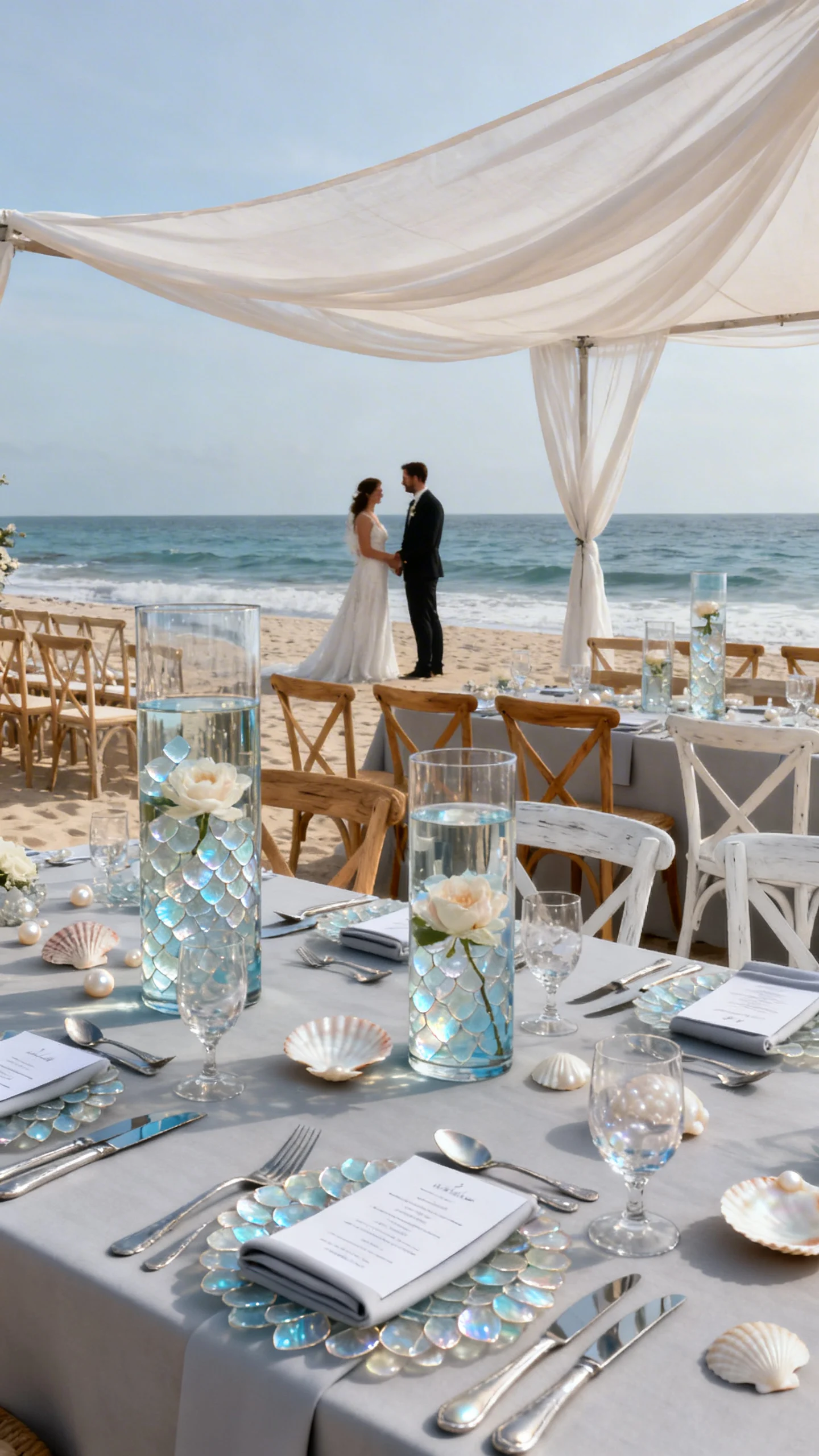 Skip overt nautical cues and lean into pearl, sand, and misty blue-gray for a coastal vibe that stays luxe. Add reflective details—capiz shell accents, mother-of-pearl flatware, and glass cylinders with floating blooms. Keep ceremony seating clean-lined and light, like natural oak or whitewashed chairs. A single statement element, like a draped linen canopy, will look editorial against the ocean.
