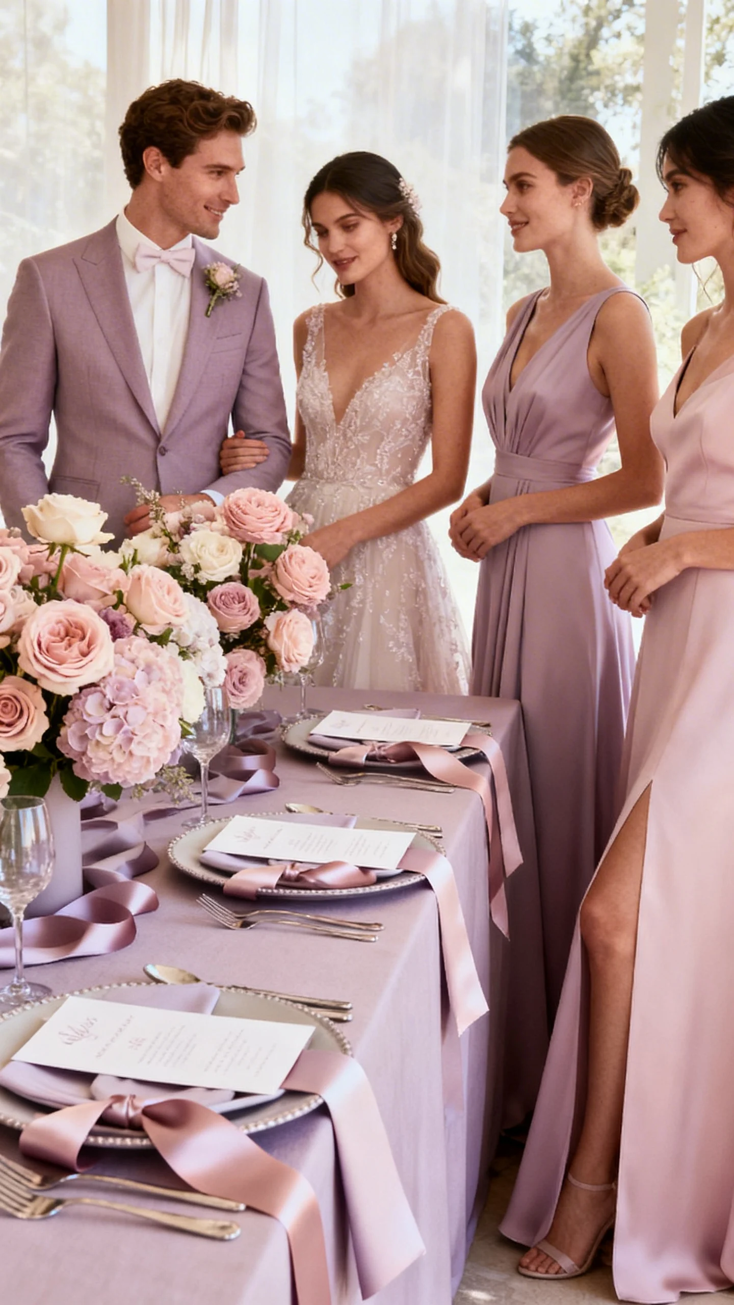 Choose one soft shade and build depth through tones: blush, rosewater, and barely-there mauve feel expensive when layered. Mix finishes—matte linens, glossy stationery, and satin ribbons—to add dimension without adding colors. Bridesmaids can wear varied silhouettes in the same family for a cohesive, modern photo. Keep florals tight and rounded for a romantic, couture vibe.