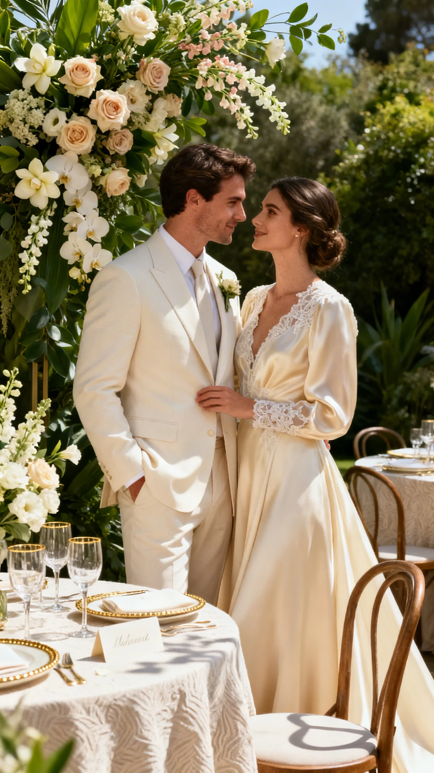 Keep the palette creamy and light with ivory, buttercream, and soft champagne, then let greenery do the heavy lifting. Choose airy florals like roses, sweet peas, and gardenias for a sculpted-but-natural look. For linens, go matte and tactile—stonewashed cotton or a subtle jacquard reads expensive in sunlight. Finish with gold-rim glassware and minimal signage for quiet polish.