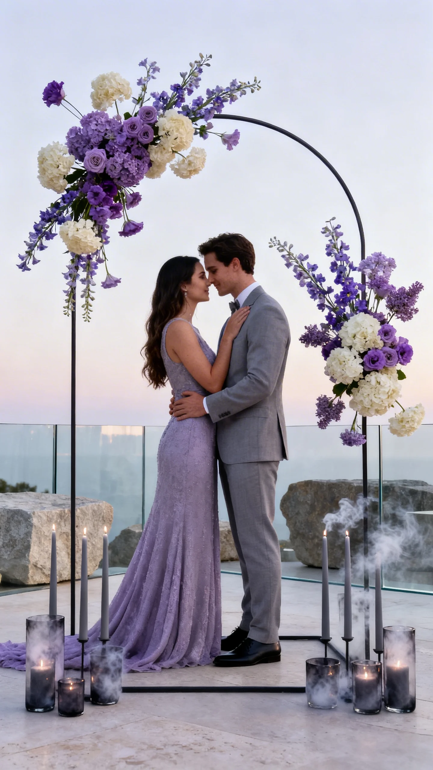 Lavender can read fresh and grown-up when balanced with dove gray, stone, and clear glass. Use lilac, lavender, and delphinium with creamy whites so the purple feels airy, not heavy. Consider gray taper candles and smoke-toned votives for a sleek contrast at dusk. A minimalist arch with asymmetrical blooms keeps the look contemporary.