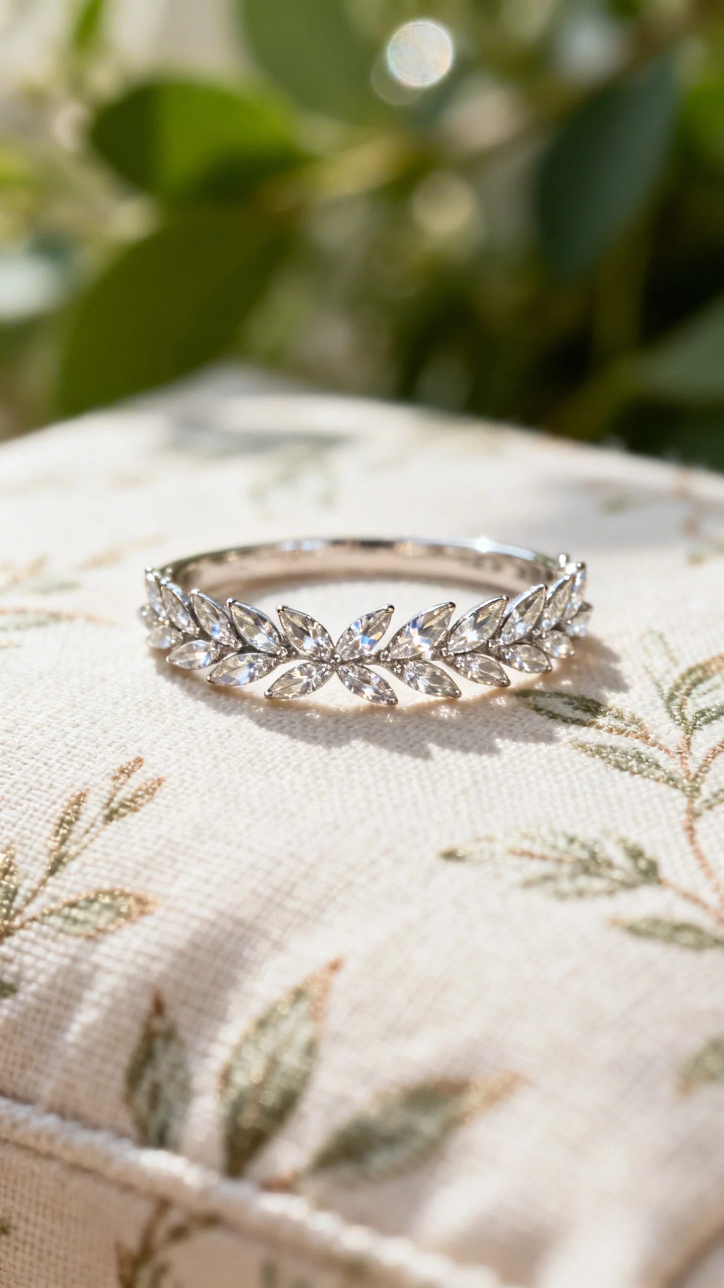 Marquise diamonds have that high-fashion feel, especially when set in a continuous row that resembles delicate leaves. They catch light dramatically and look incredible in close-up detail shots. Choose a north-south orientation for a sleek look, or mix in tiny rounds for extra shimmer. This band shines at garden weddings, château venues, and anything with romantic styling.