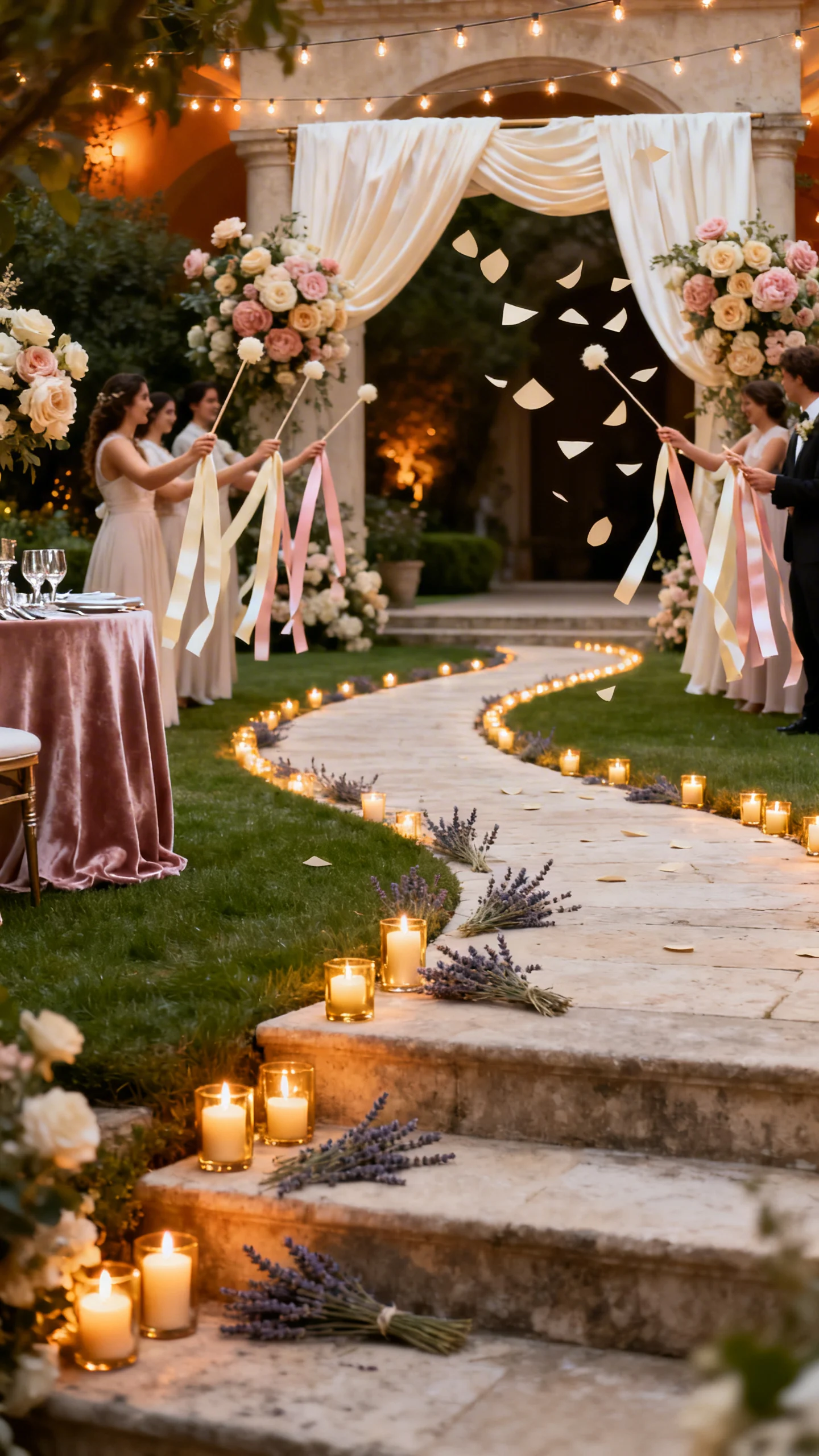 Choose a send-off that complements the scenery: sparklers (if permitted), ribbon wands, or a candlelit path. If you want movement, consider biodegradable confetti in a neutral tone or dried lavender tossed lightly. Keep the palette cohesive so the exit photos look timeless. The goal is romance and glow—not beach gimmicks.