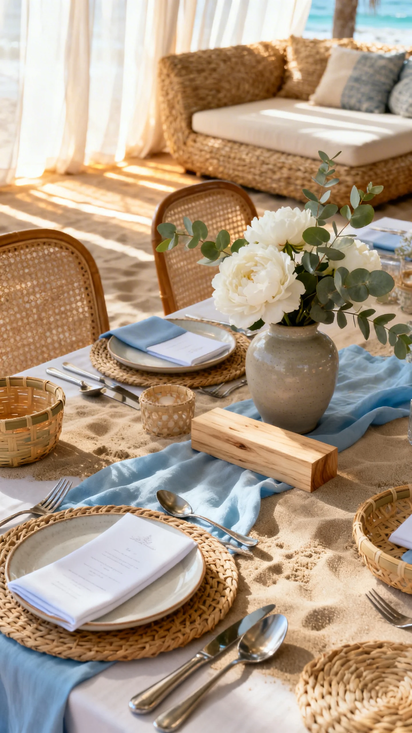 Lean into rattan, cane, bamboo, light oak, and woven seagrass for chairs, charger plates, baskets, and lounge accents. Pair them with matte ceramics and brushed metals rather than shiny chrome. This mix reads coastal without going literal. It also photographs beautifully against sand and ocean tones.