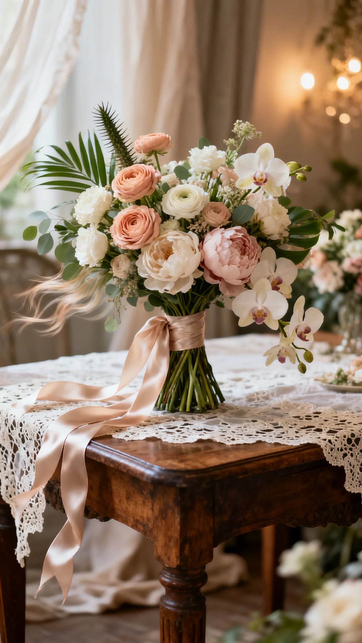 Go for a bouquet that could exist anywhere beautiful: garden roses, ranunculus, peonies (in season), or orchids with gentle movement. Keep greenery soft and intentional—avoid anything too spiky or overly tropical unless your venue is actually lush and tropical. Wrap stems with raw silk ribbon that can flutter in the wind. It reads romantic in every candid moment.