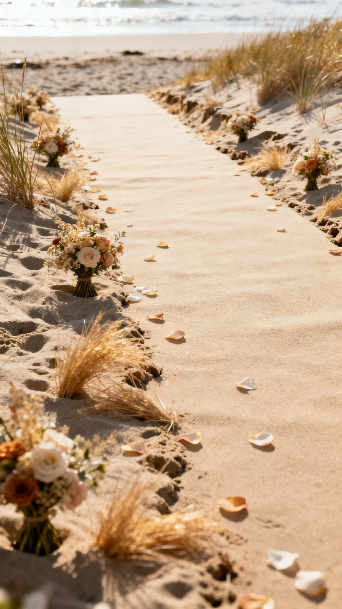 Instead of an aisle lined with seashells, try a minimal ground arrangement approach: small floral clusters tucked into the sand or along a simple walkway. Add tonal petals or dried grasses sparingly so it looks organic, not scattered. Keep the aisle edges uneven and natural, like a coastline. This style feels romantic and editorial.