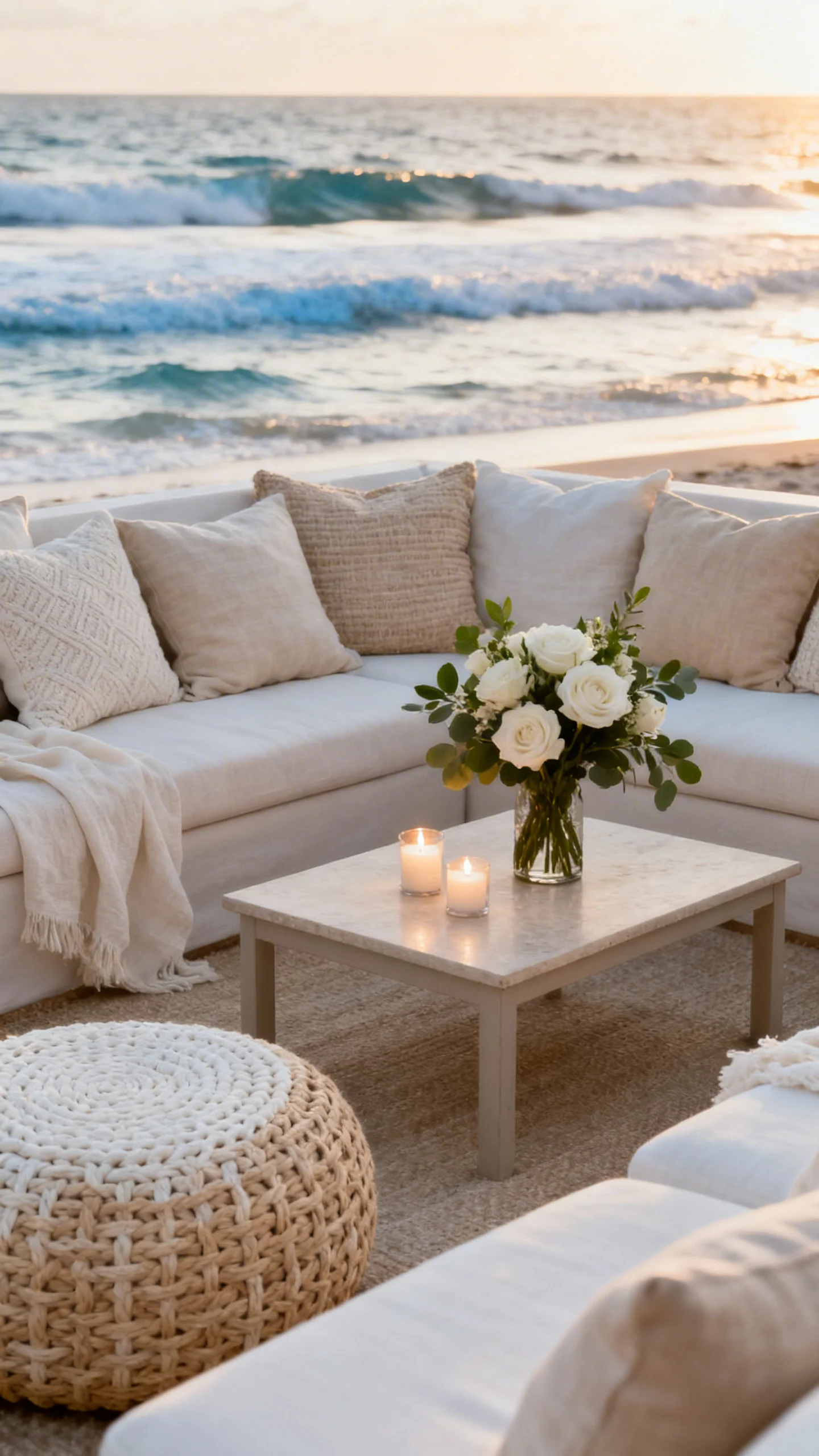 Use the beach as the backdrop and focus on texture, lighting, and a restrained palette. Avoid literal décor (shells, anchors, novelty signs) and choose elevated materials like linen, ceramics, and woven neutrals. Romantic details—candlelight, soft florals, and airy draping—do more than any “theme” item.