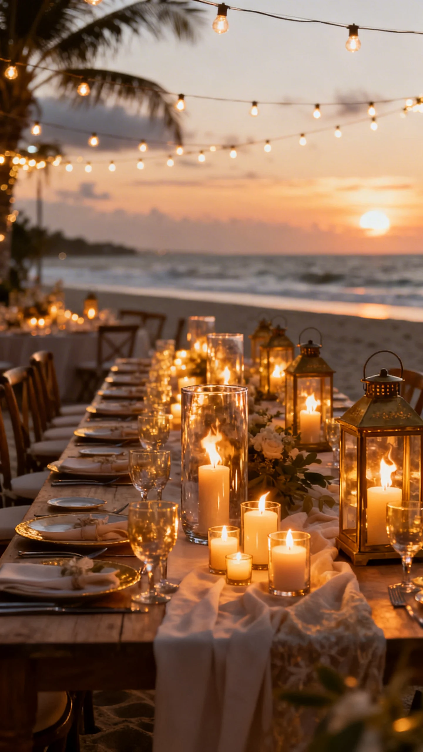 Beach receptions get magical when the lighting feels warm and layered. Use hurricane glass, votives, and lanterns to protect flames from wind, and add bistro lights or soft uplighting to avoid harsh overhead brightness. Cluster candles in groups of three to five for a romantic rhythm down the tables. Your photos will look golden, not washed out.