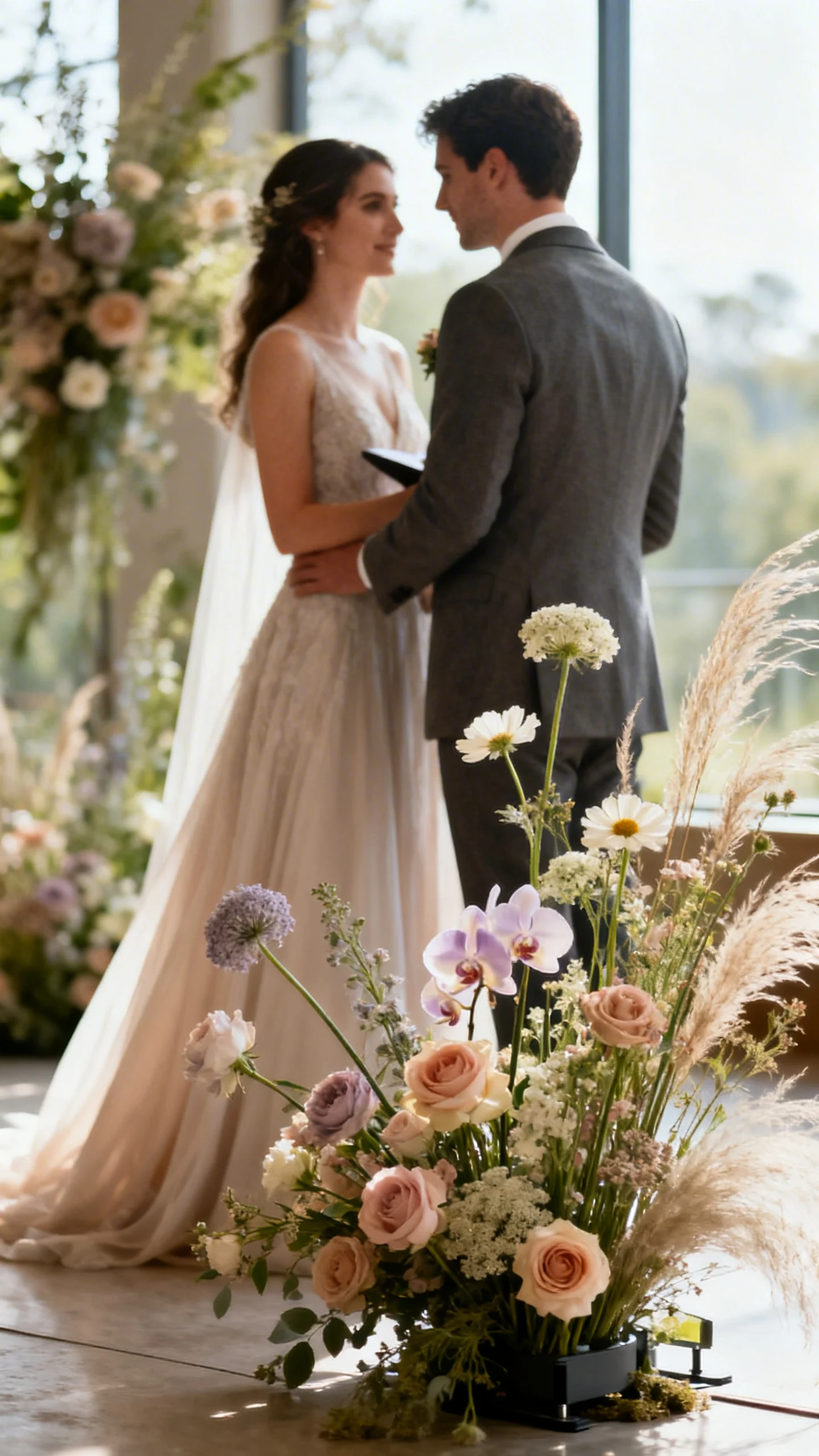Choose arrangements that look beautiful even when the breeze moves them—think meadow-style clusters, asymmetrical sprays, and lower profiles. Use sturdy stems (roses, lisianthus, orchids, spray roses) mixed with lighter elements (cosmos, scabiosa, airy grasses). Anchor installations discreetly with hidden mechanics so nothing looks “tied down.” The result feels effortless, not staged.
