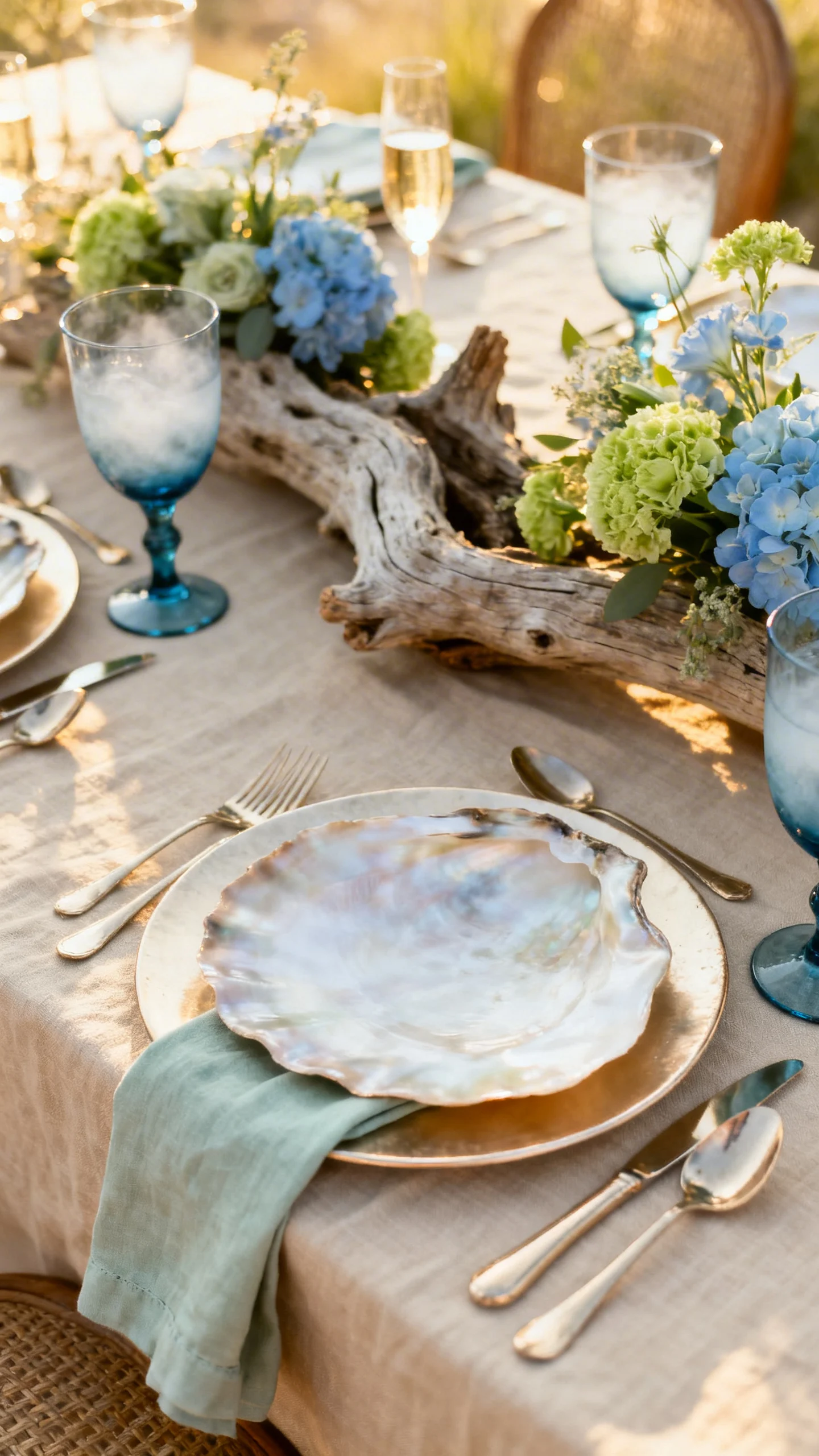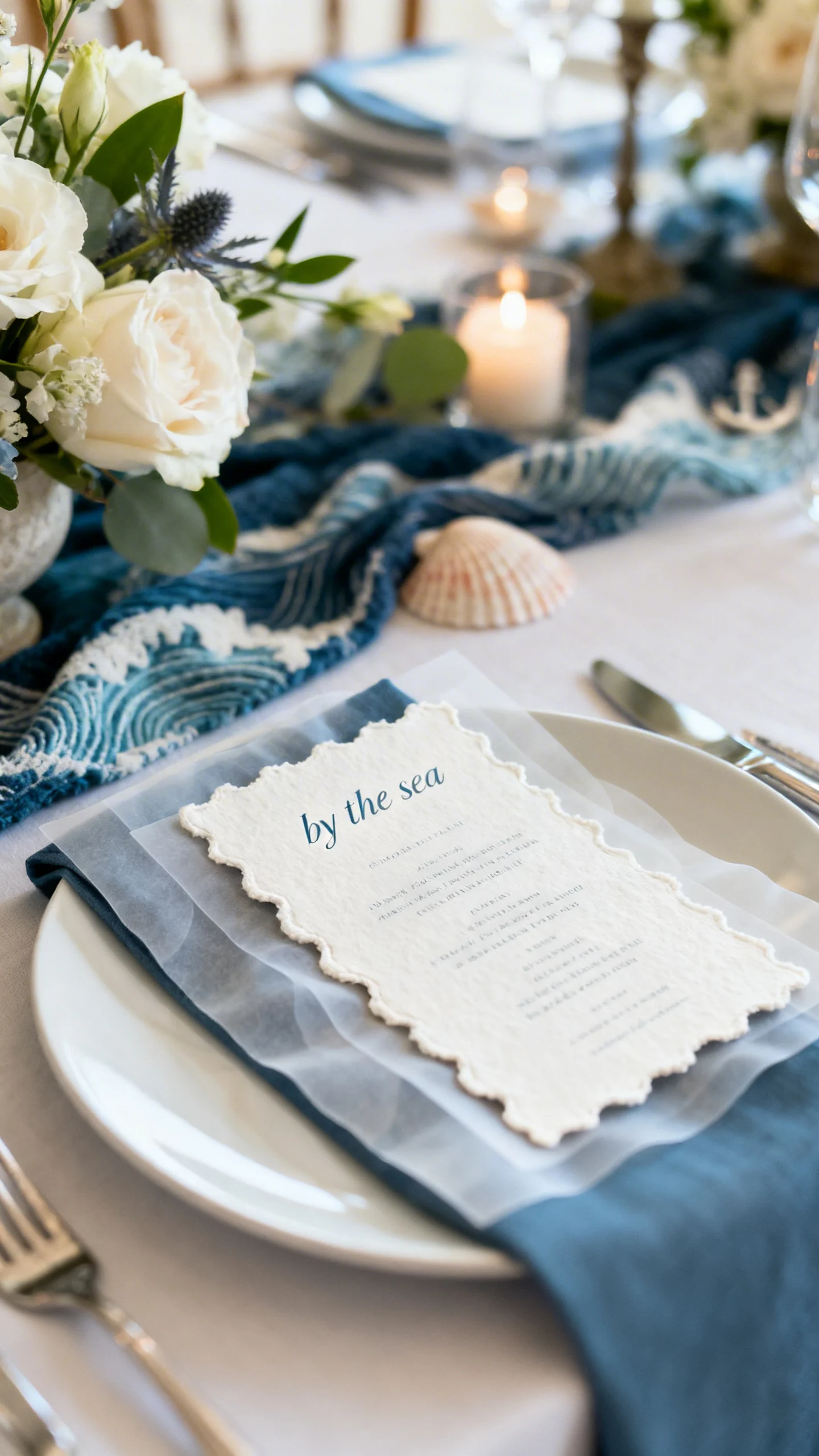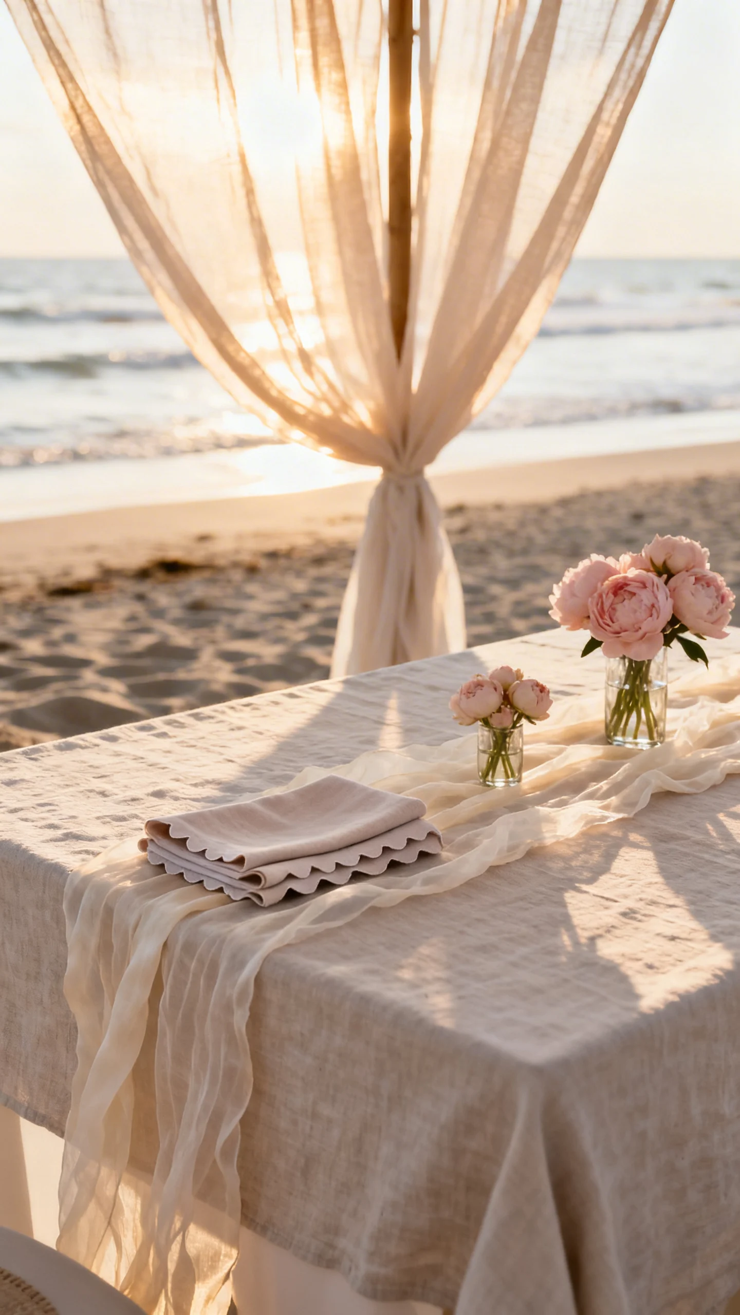 Upgrade the whole aesthetic with elevated linens: stonewashed linen, gauze runners, and tonal napkins. Layer in one standout detail—like scalloped edges, a subtle stripe, or raw silk—to keep it modern. Let the beach be the “theme,” and keep tabletop décor simple and intentional. It’s a small shift that instantly feels more romantic.
