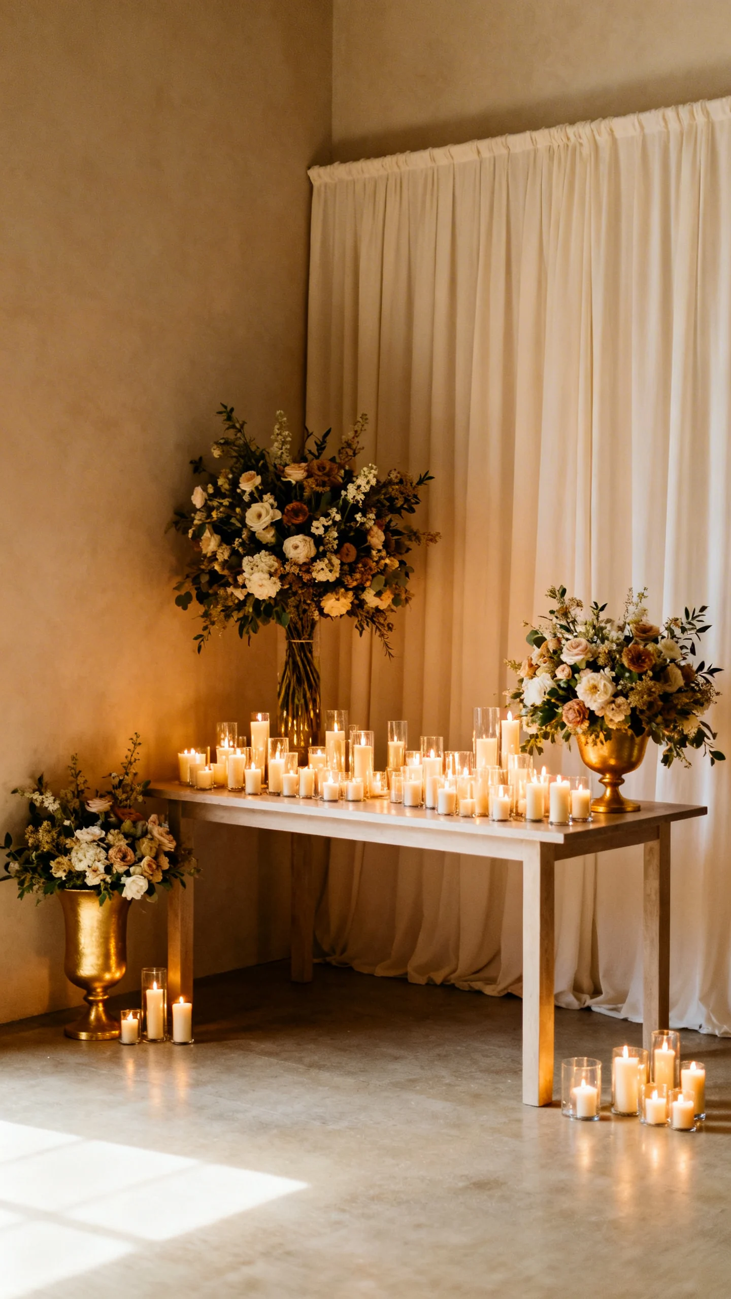 - Hurricane glass + votives: safer for windy venues and creates a layered glow.