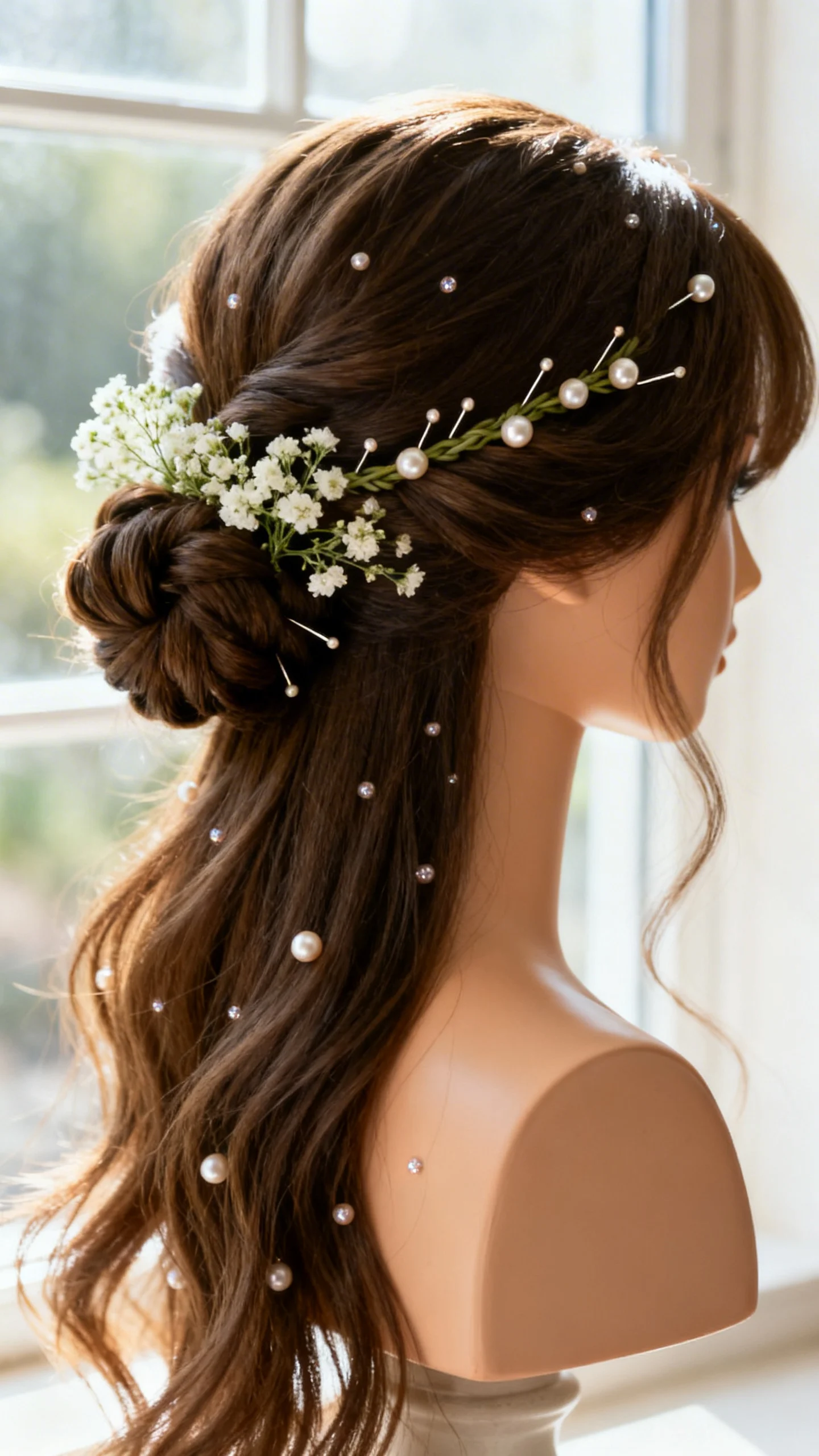Half-up twist with baby’s breath and pearl pins