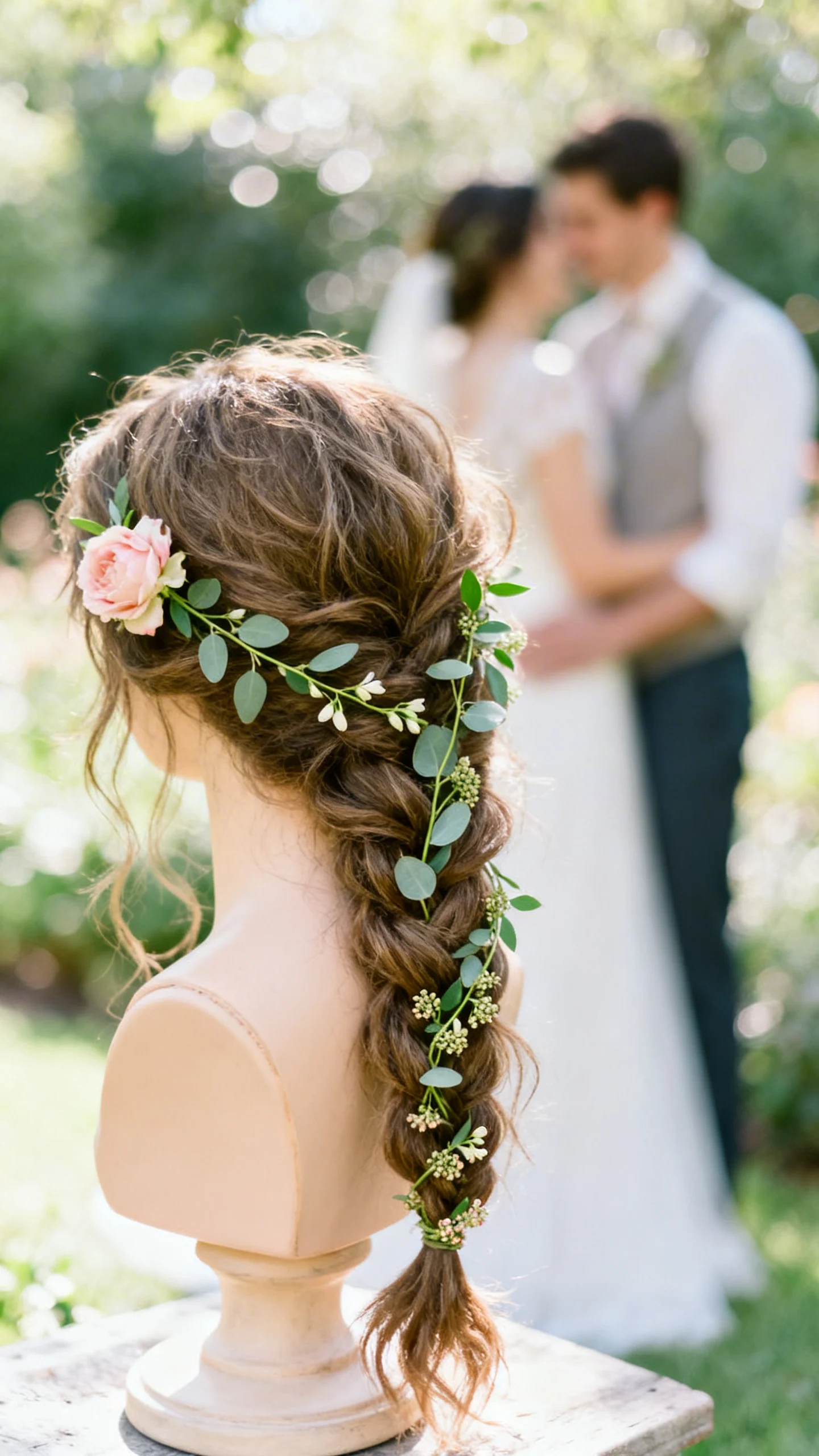 A loose boho braid looks romantic when it’s full and slightly undone, especially with greenery threaded through the weave. Add a few blush blooms near the start of the braid and taper to smaller pieces toward the end for balance. Ask your florist for flexible greenery like jasmine vine or seeded eucalyptus (used sparingly) to avoid stiffness. This is a dreamy choice for garden ceremonies and countryside venues.