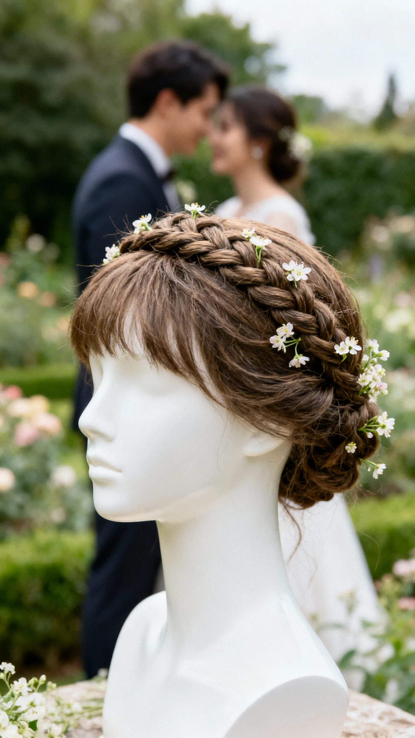 A braided crown is made for soft romance, especially when the braid is gently pulled wider for a lived-in finish. Add tiny blossoms every inch or two, focusing on the sides where cameras catch the detail. If you’re using fresh flowers, keep stems short and wrapped so nothing pokes. This style is ideal for outdoor ceremonies because it holds shape while still looking ethereal.