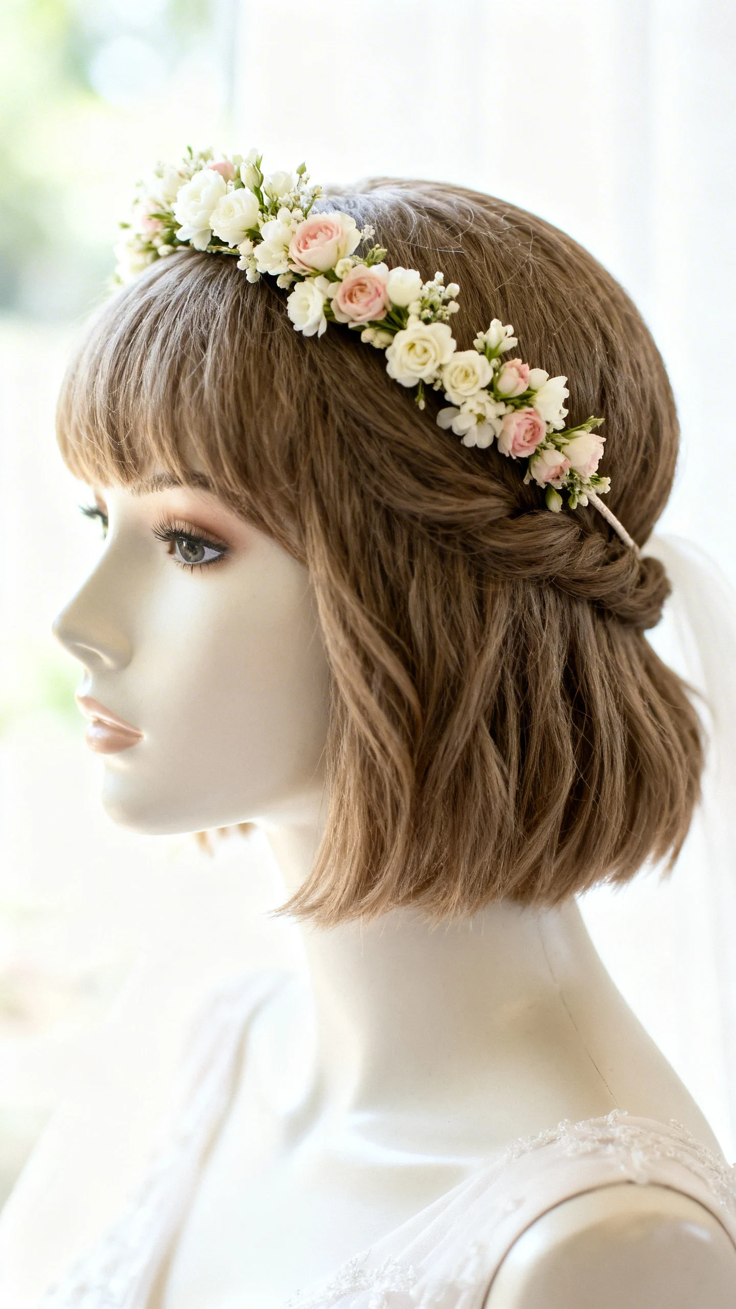 Soft romantic florals aren’t just for long hair—short cuts look stunning with a floral halo headband. Keep the scale delicate so it complements your features instead of overpowering them. Position it slightly back from the hairline for a modern, not costume-y feel. This also solves the “what do I do with my hair?” question for bobs and lobs in the prettiest way.