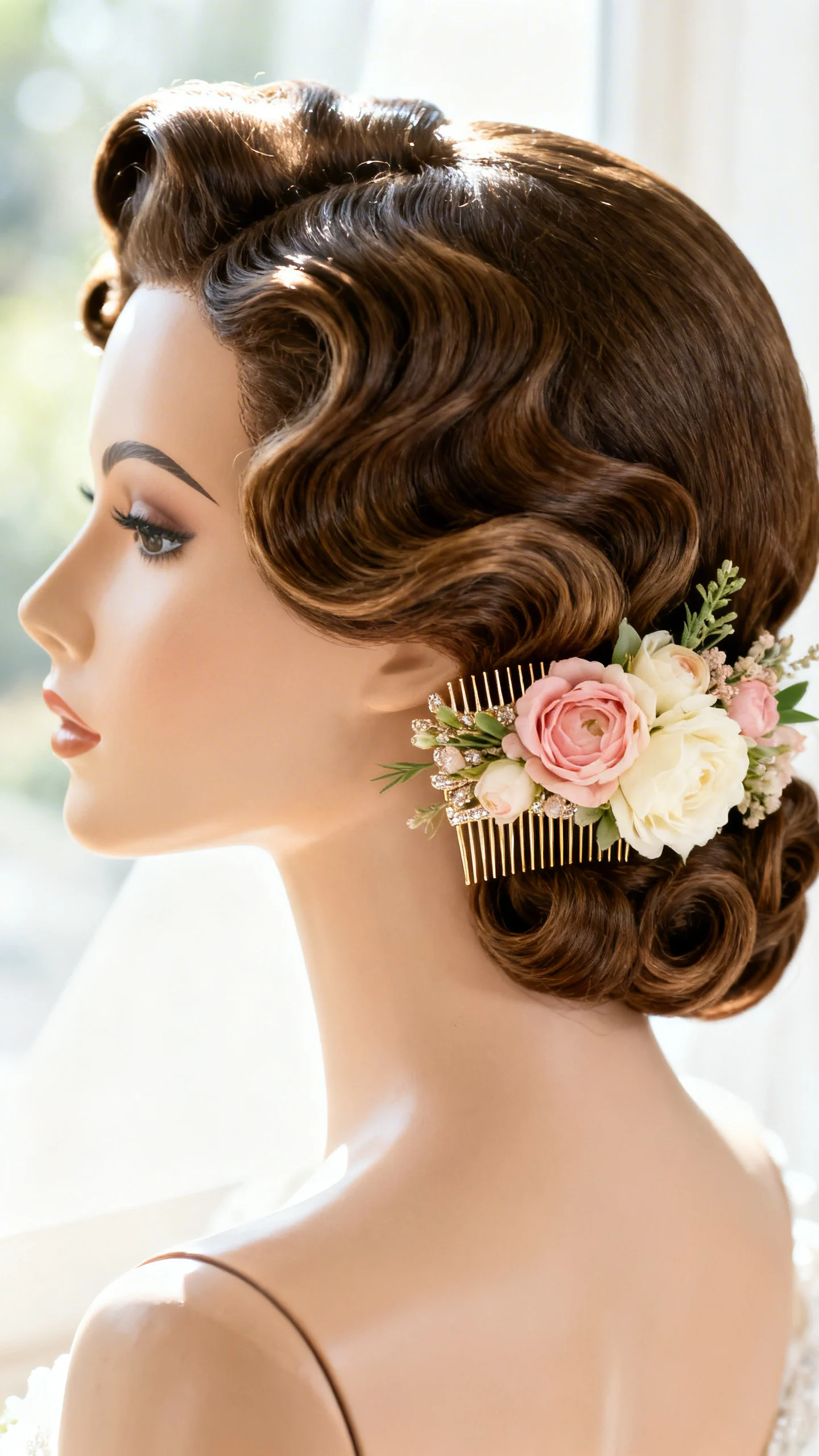 Side-swept curls give a classic Hollywood feel, and a floral comb adds the wedding-day “wow” without needing lots of loose blooms. Choose a comb that matches your bouquet palette, then position it where the hair is secured for the strongest hold. This style shines in portraits and highlights neckline details on one side of your dress. It’s also friendly for brides who want a big floral moment with minimal fuss.