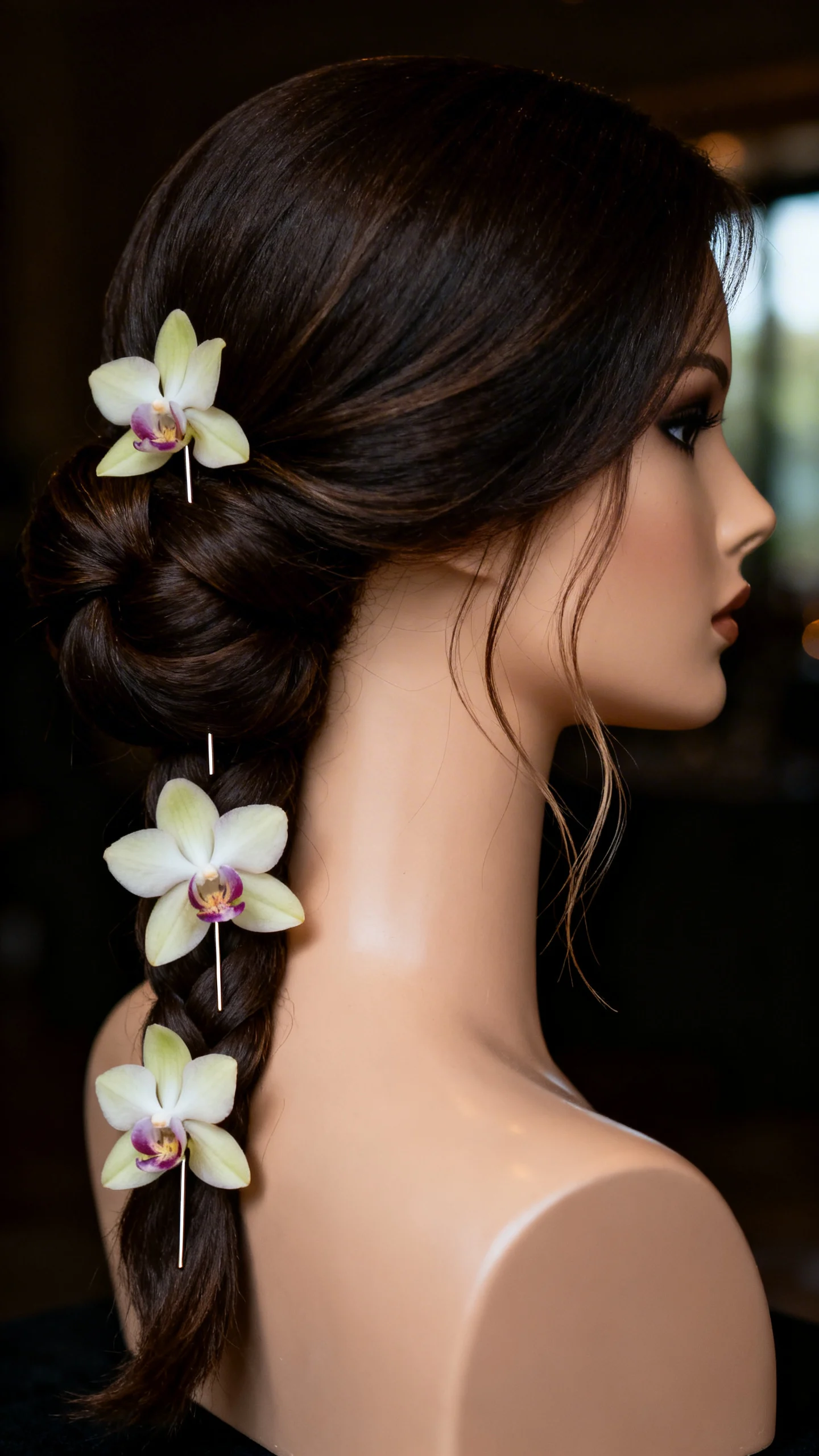 A French twist is sleek by nature, but you can soften it by leaving a few wispy pieces and adding orchids or orchid-inspired pins. Place the floral accents vertically along the twist to elongate the silhouette. This style pairs beautifully with clean, modern gowns and dramatic veils. It also reads upscale and intentional for evening weddings.
