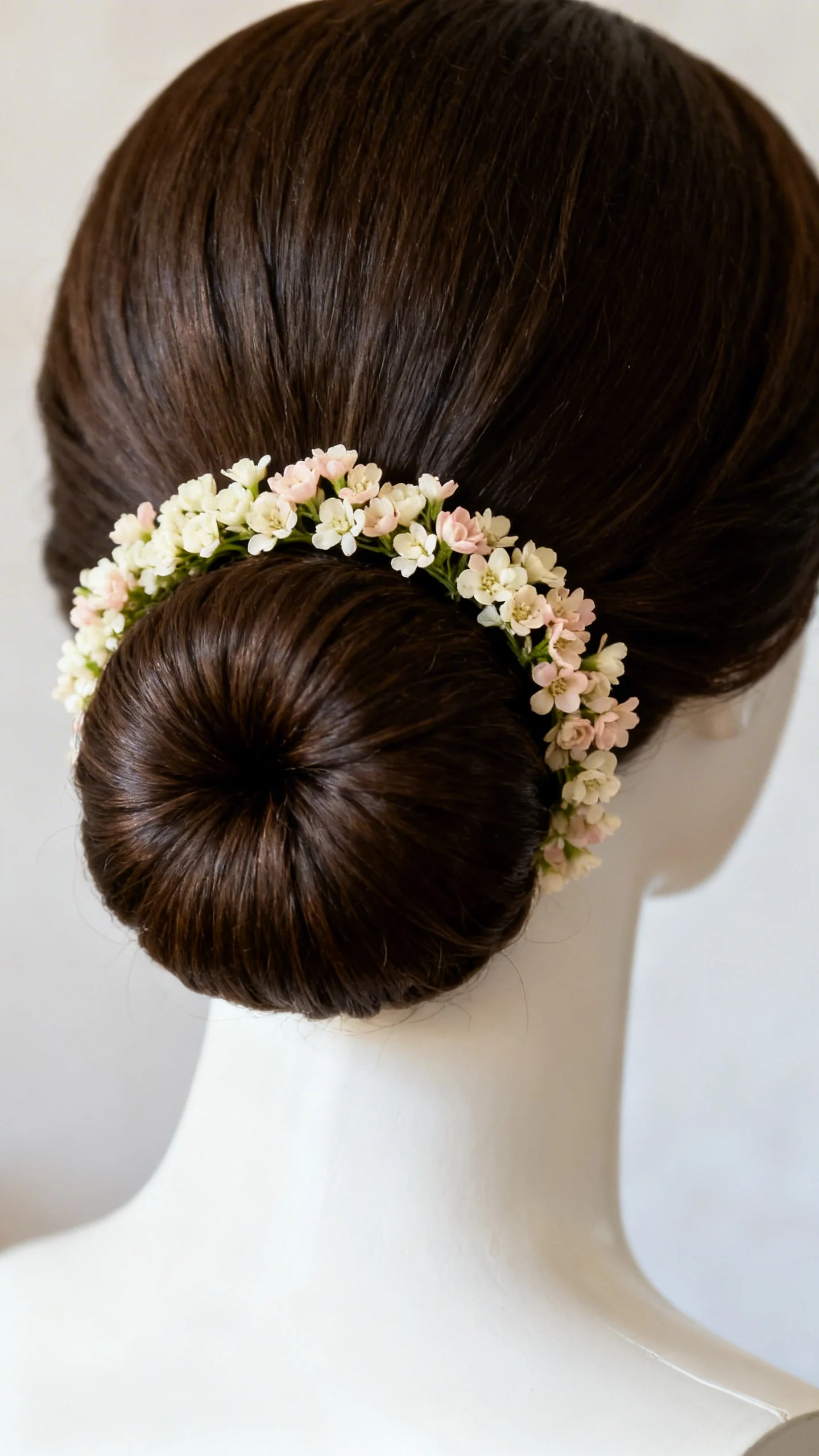 A low chignon feels timeless, but adding a crescent of tiny blooms at the nape makes it instantly soft and bridal. Keep the flowers small and close to the bun so the shape stays refined, not bulky. This is a great option if you want your veil to sit higher without covering your florals. It’s also a smart pick for humid weather because the hair is controlled and polished.