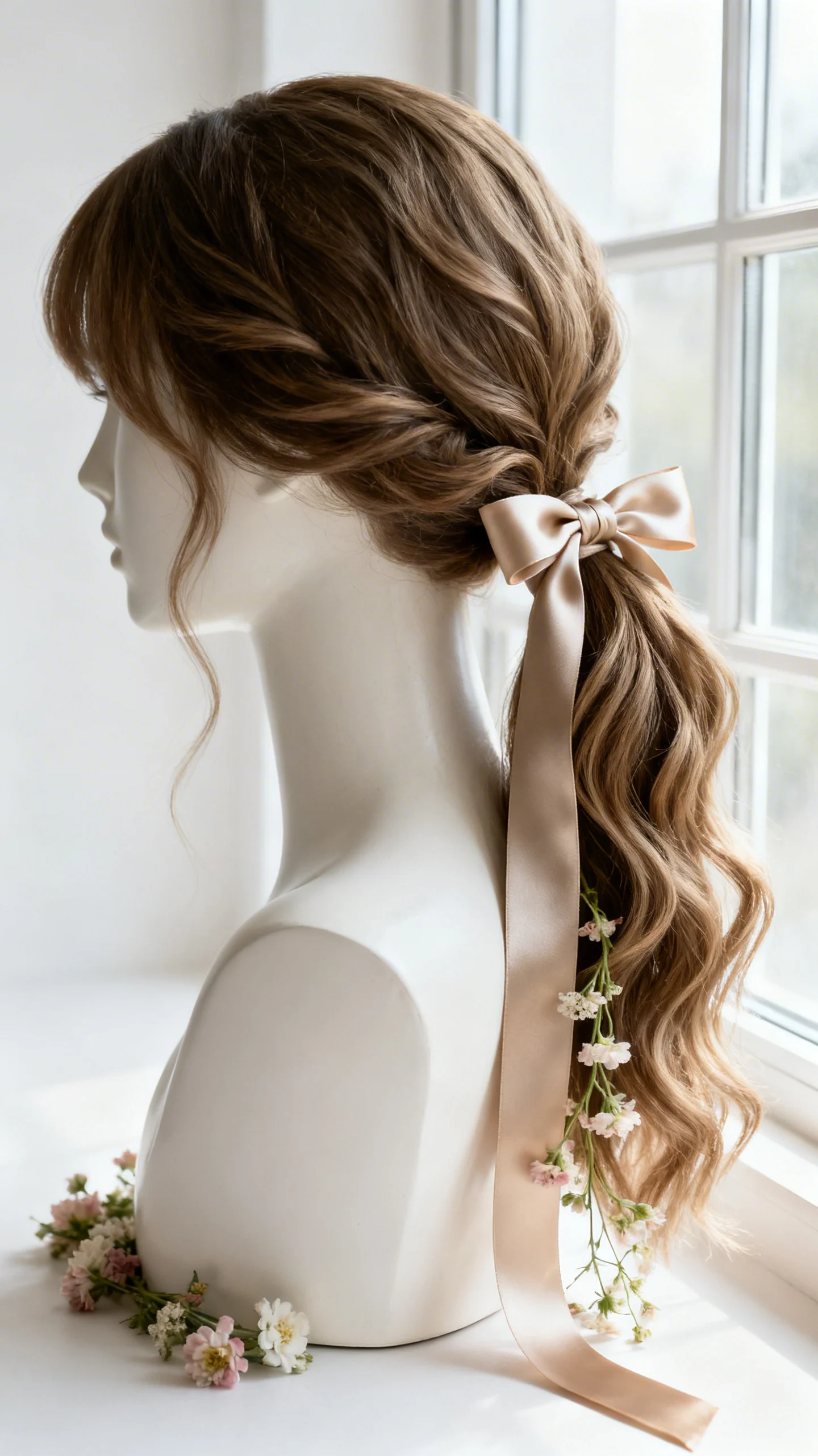 Low ponytail with ribbon and scattered florals