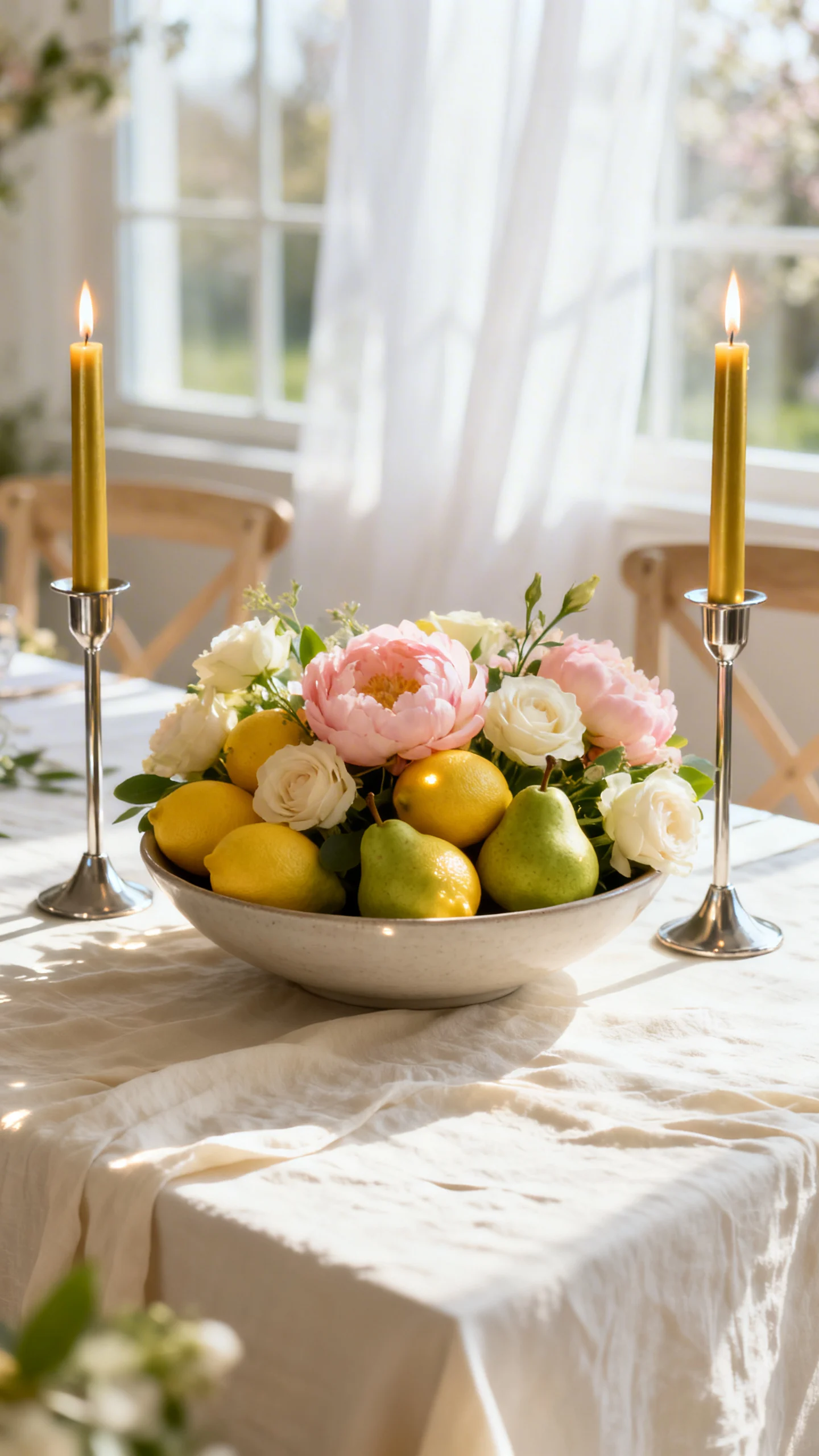 For a fresh spring twist, mix florals with a little produce like lemons, kumquats, or green pears in a low bowl. Add two taper holders on either side to frame the arrangement and bring in candlelight without crowding the centerpiece. Keep the fruit in one color family so it looks intentional. This style shines at daytime receptions that still want a romantic glow as the sun sets.