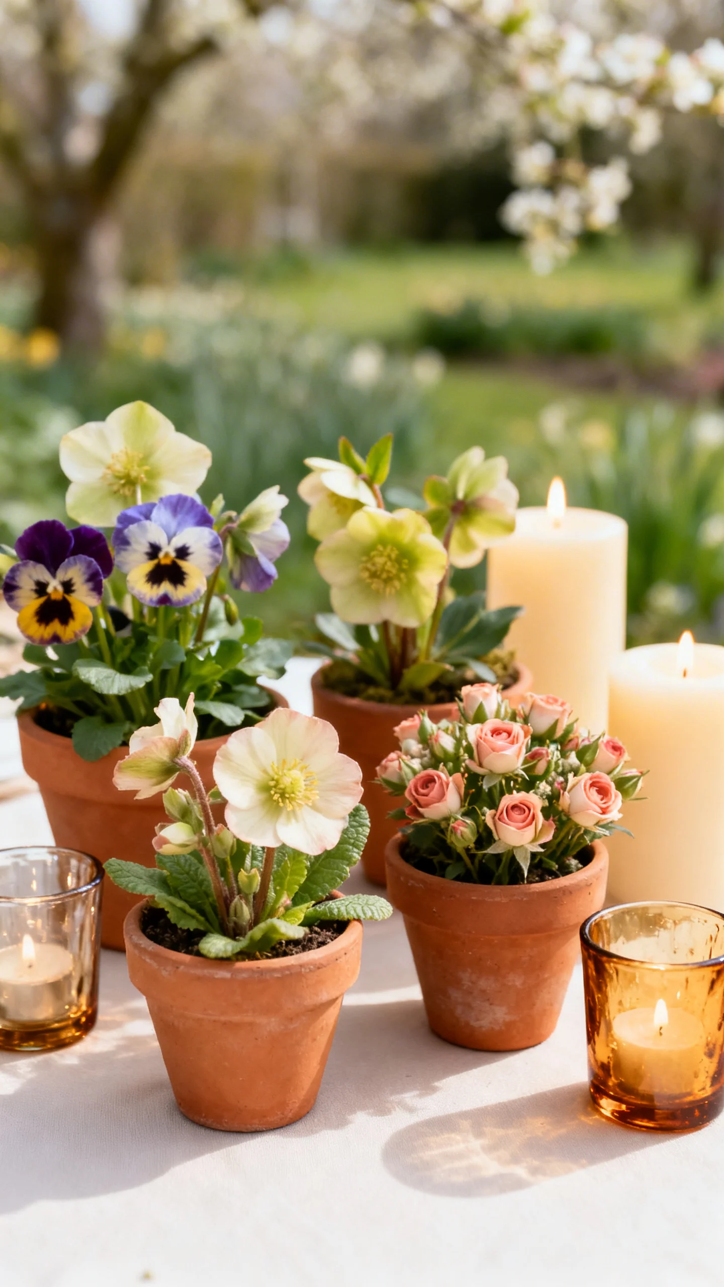 Terracotta instantly reads “spring garden,” and it pairs beautifully with creamy candlelight. Use small terracotta pots with mini floral groupings (pansies, hellebores, or tiny rose clusters) and place a few votives around them. Keep the candles in clear or amber glass for warmth and cohesion. This idea is adorable for brunch receptions and outdoor tented dinners.