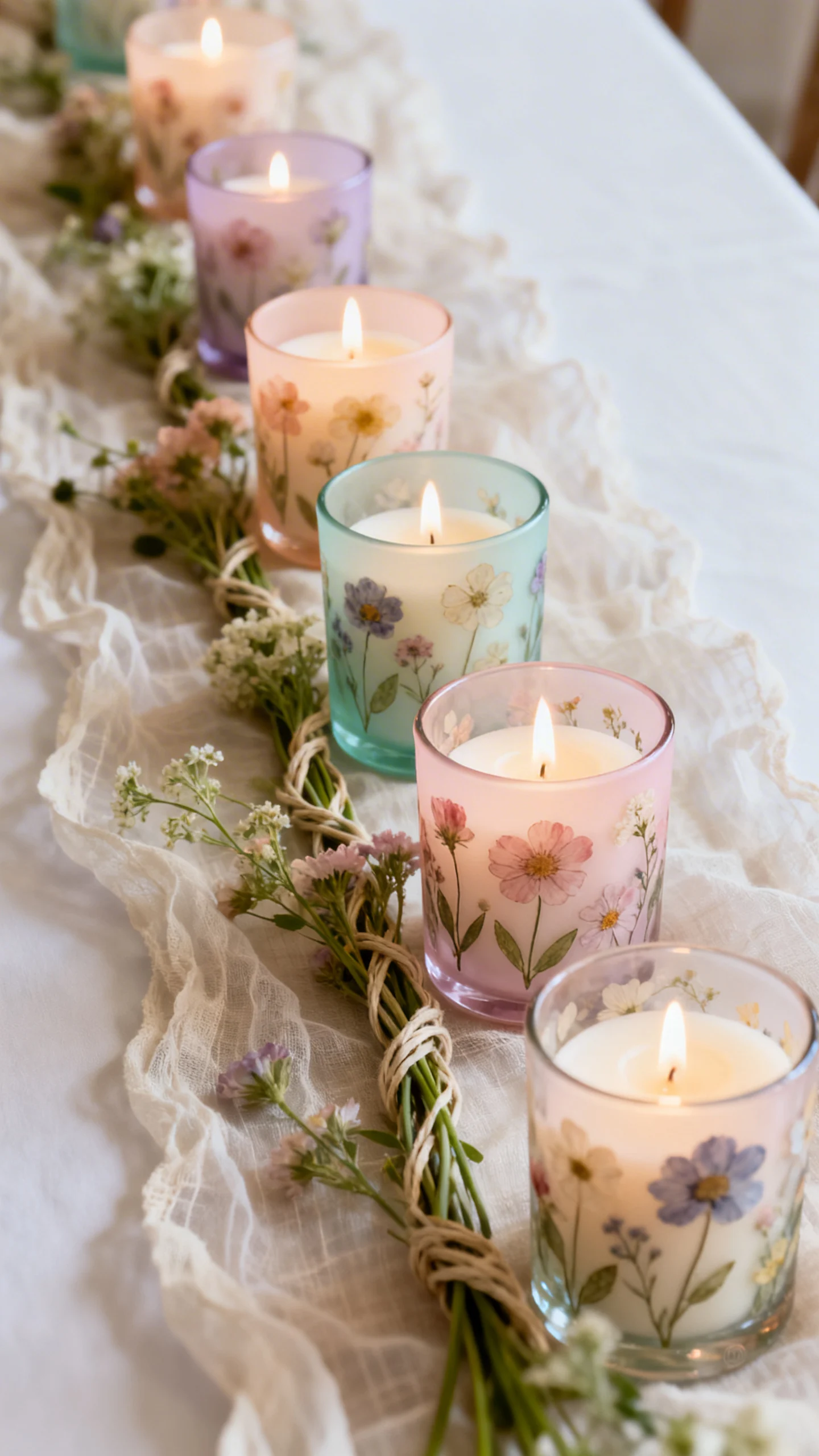 Pressed-flower candle holders feel delicate and springy, and they photograph beautifully for Pinterest-style flat lays. Line several holders down a gauzy linen runner and weave in a few loose stems for a “just picked” vibe. Use real wax candles or high-quality flameless options depending on venue rules. The key is repetition: same holders, consistent spacing, and a limited color palette.