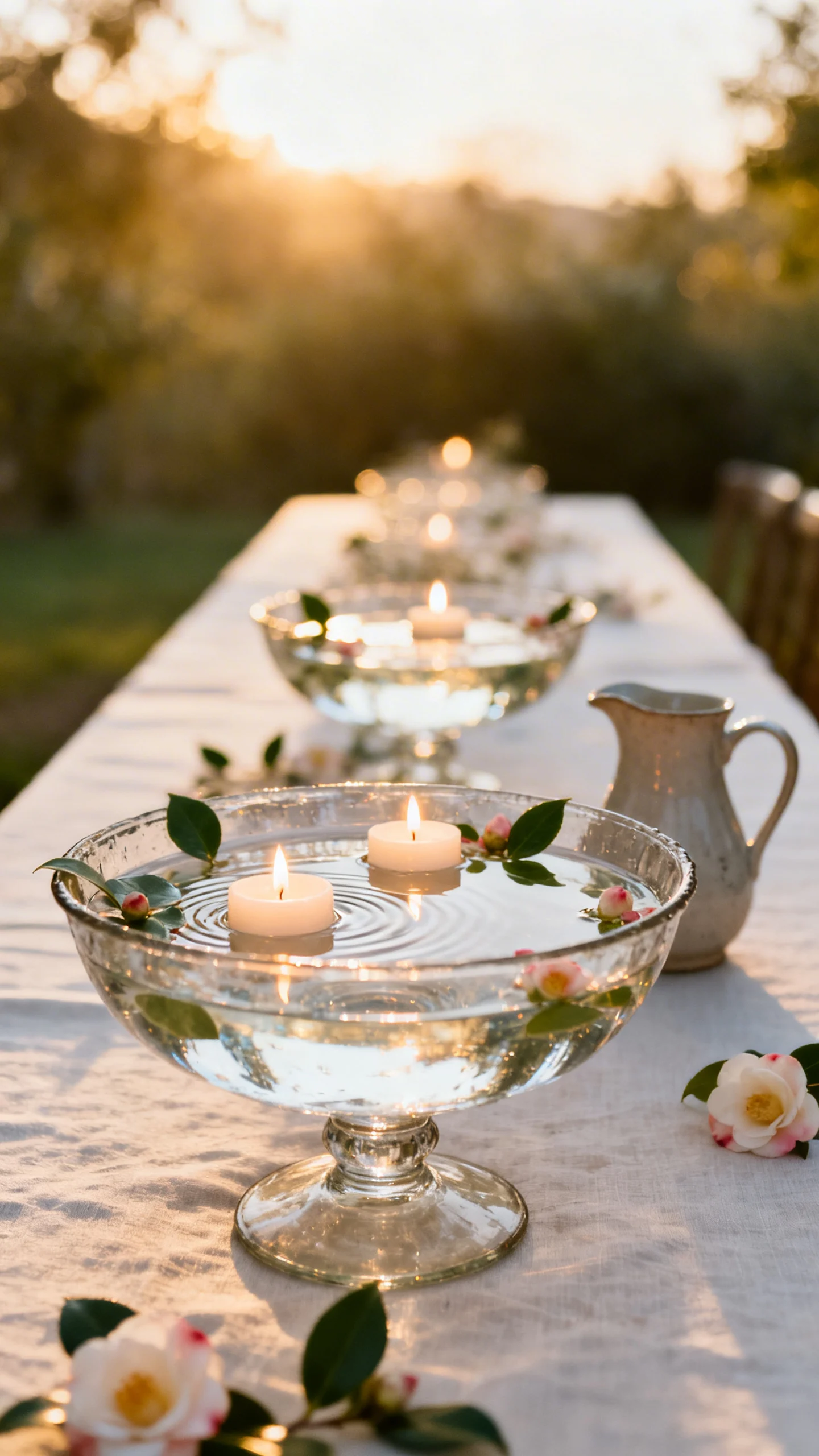 Floating candles look lush and romantic, and they’re surprisingly simple to set up. Use low glass bowls or compotes, fill with water, add one to three floating candles, and scatter a few camellia leaves or tiny blooms around the edge. This works beautifully for long tables because it doesn’t block sightlines. Keep a small pitcher nearby for easy topping-off if the venue is warm.